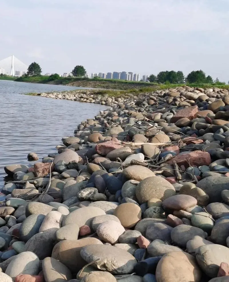 这些石头其实是湘江的杰作,湘江从岳麓山西侧流过,水流速度快的时候会把上游的岩石碎块带下来,砸在河床上,磨啊磨,磨成圆润的砾石,水位降低的时候这些石头就露出来,堆积在河滩上,年复一年,就形成了现在这片砾石群。地质学上管这个叫河漫滩沉积,是典型的河流地貌,但在城市里能看到这么大规模的砾石滩,确实少见,因为大部分河道都被硬化了,水泥堤坝一修,自然形态就没了。