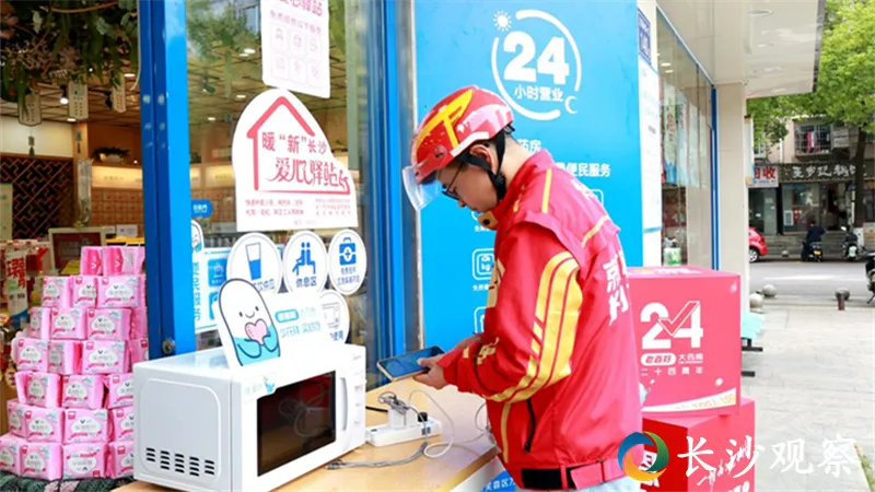 在芙蓉区的一家老百姓大药房,外卖骑手刘新云熟门熟路地接水、热饭,顺便测了个血压。
