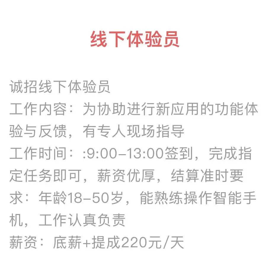 要求18-35岁,男女不限,每天要10个人,工作时间三个小时左右,工资100,现结