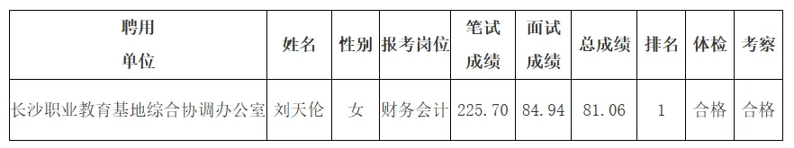 根据《2025年长沙市直事业单位第二批公开招聘工作人员公告》要求,长沙市教育局所属事业单位长沙职业教育基地综合协调办公室公开招聘财务会计岗工作人员1名,经网上报名、笔试、资格审查、面试、体检、考察等程序,拟聘用刘天伦同志,现予以公示如下,公示时间为2026年3月23日至2026年3月29日。