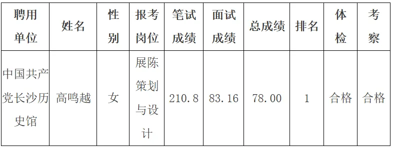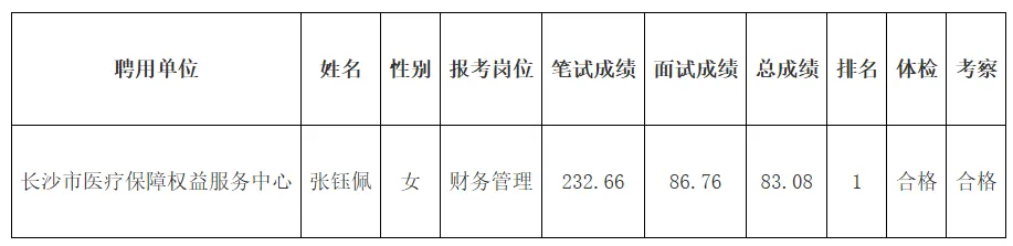 根据《2025年长沙市直事业单位第二批公开招聘工作人员公告》要求,长沙市医疗保障局所属事业单位长沙市医疗保障权益服务中心公开招聘财务管理岗工作人员1名,经网上报名、笔试、资格审查、面试、体检、考察等程序,拟聘用张钰佩同志,现予以公示如下,公示时间为2026年3月23日至2026年3月29日。