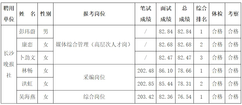 根据《2025年长沙市直事业单位第二批公开招聘工作人员公告》要求,长沙晚报社公开招聘媒体综合管理岗、采编岗、综合岗工作人员共6名,经网上报名、笔试、资格审查、面试、体检、考察等程序,拟聘用彭玮蔚等6名同志,现予以公示如下,公示时间为2026年3月23日至2026年3月29日。
