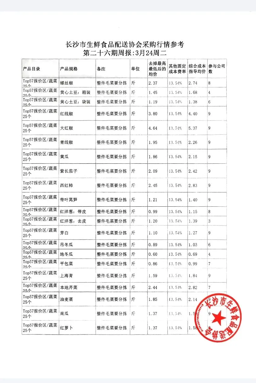 长沙市生鲜食品配送协会第二十六期直接采购成本与含费综合成本行情 参考| 3月24日 周二 周报