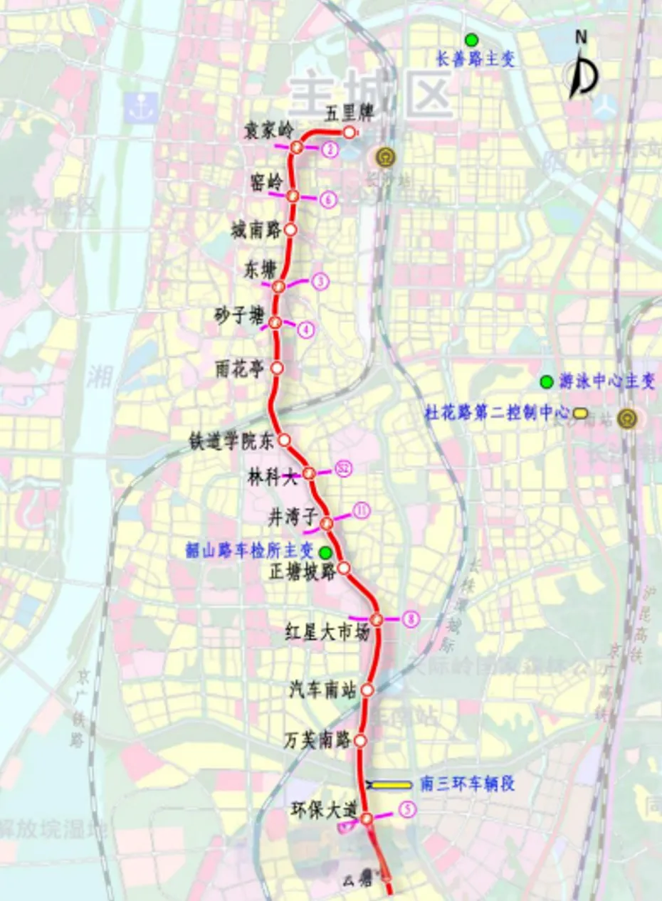 共设7座地下车站,平均站间距约1.36公里,其中包含2座换乘站——中信广场站(换乘地铁1号线及长株潭城际铁路S1号线)、长沙理工大学站(换乘在建地铁7号线)。