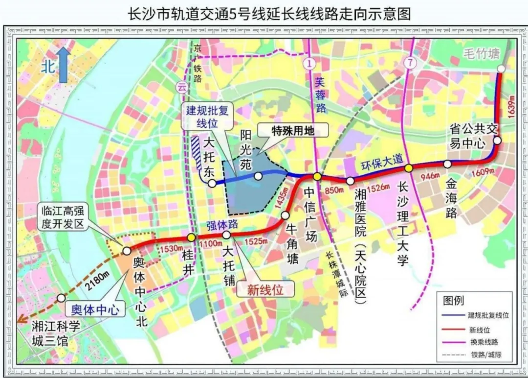 地铁5号线南延线起于毛竹塘站(不含),止于大托铺站,整体呈东西走向,主要沿规划强体路、天心大道、环保大道、万家丽路敷设,线路全长约9.25公里,采用全地下敷设方式。