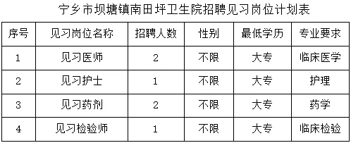宁乡市坝塘镇南田坪卫生院是经宁乡市人社局审核认定的“湖南省长沙市高校毕业生就业见习基地”,现根据医院工作需要,特面向广大高校毕业生公开招聘见习生6人,具体公告如下: