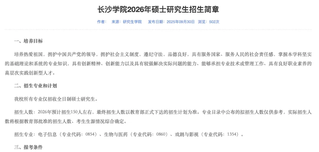>戏剧考研 | 2026年长沙学院戏剧硕士招生简章、专业目录