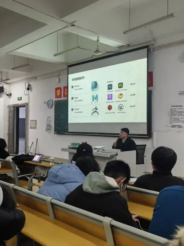 交流会上,知了CG的老师为学院师生带来了主题为《3D游戏动漫设计 —— 行业及流程分享会》的专题讲座。哈瑞老师与dalu老师结合自身多年行业经验,从3D游戏动漫行业的发展现状、市场前景、岗位细分,到游戏建模、角色设计、场景制作等全流程技术要点,进行了全方位、深入浅出的讲解。