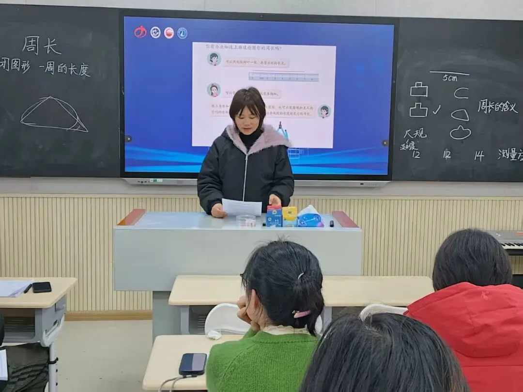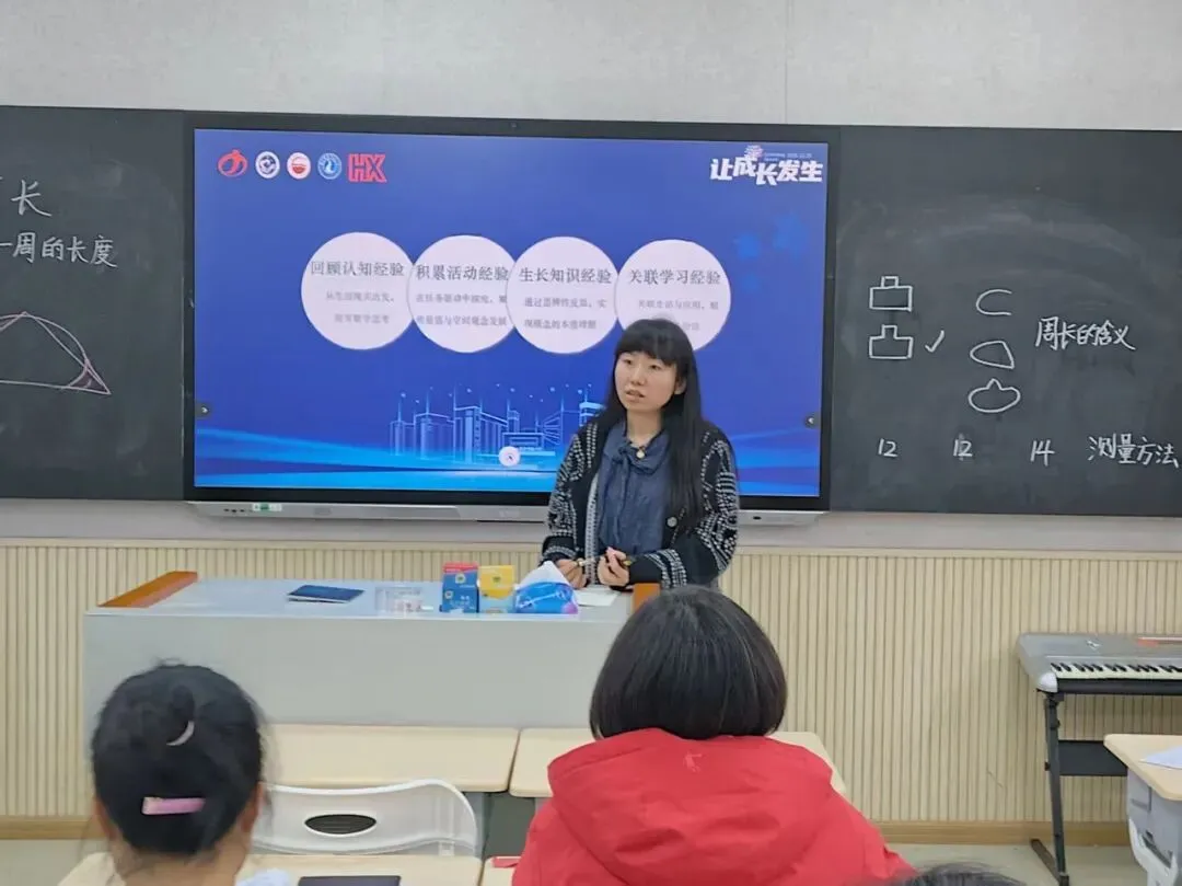随后,杨文婷老师针对《周长的认识》这一课进行专业说课分享。她结合新课标理念,以“四经验”递进式教学模型为核心,系统阐述教学设计思路: