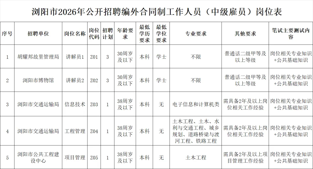 原标题:浏阳市2026年公开招聘编外合同制工作人员(中级雇员)公告