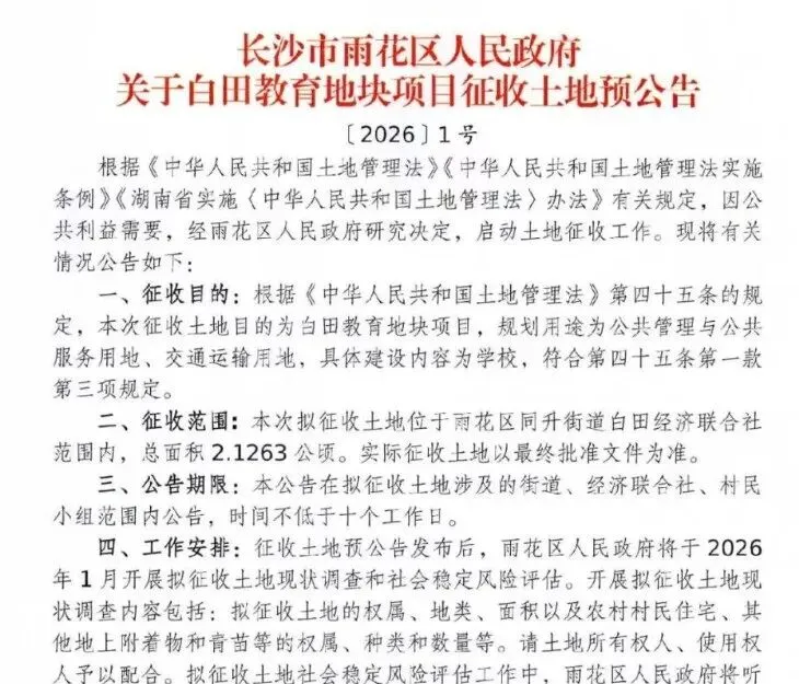 2026年开年以来,长沙雨花、开福、天心、芙蓉四大主城核心区密集发布土地征收预公告,多个片区确定拆迁,涉及教育、交通、城市更新等多个民生与发展项目。