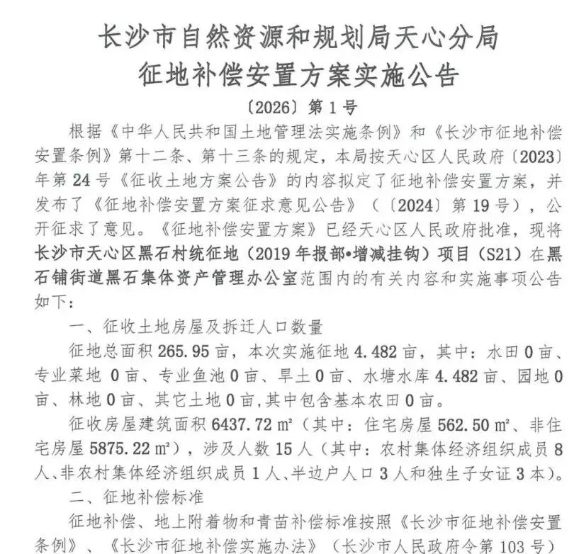 今年2月,长沙发布了《长沙市集体土地征收补偿安置办法》,自2月1日起施行,有效期5年。为全市集体土地征收提供统一执行标准,核心新规如下长沙市政府: