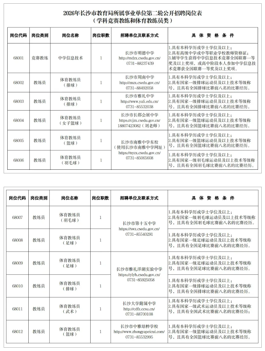 4.《2026年长沙市教育局所属事业单位第二轮公开招聘岗位表(学科竞赛教练和体育教练员类)》