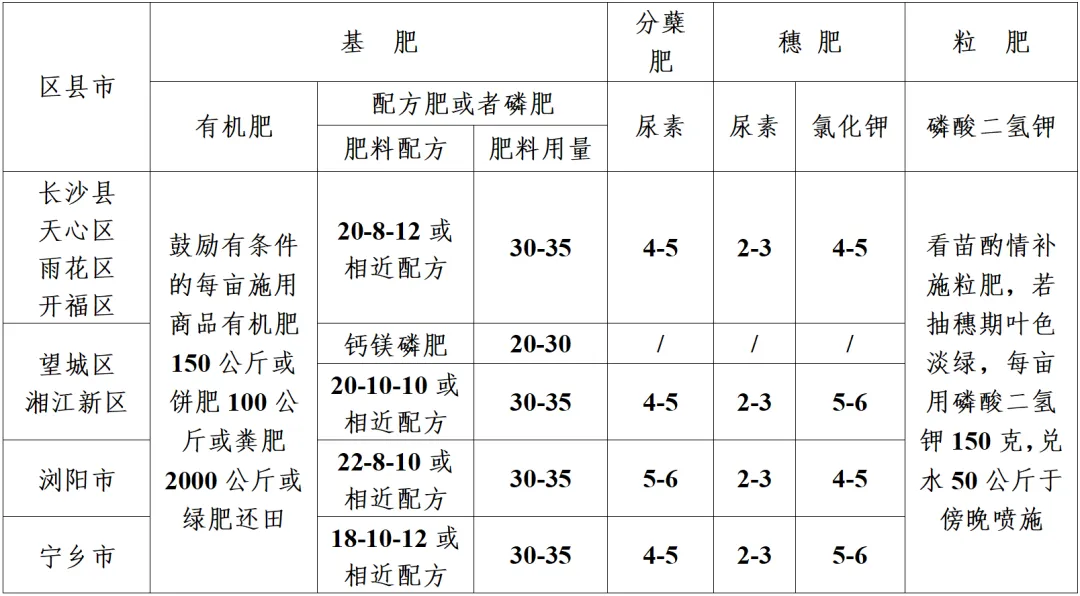 1.肥料用量。按照早稻亩产500公斤计,长沙市不同地区早稻推荐施肥量见下表: