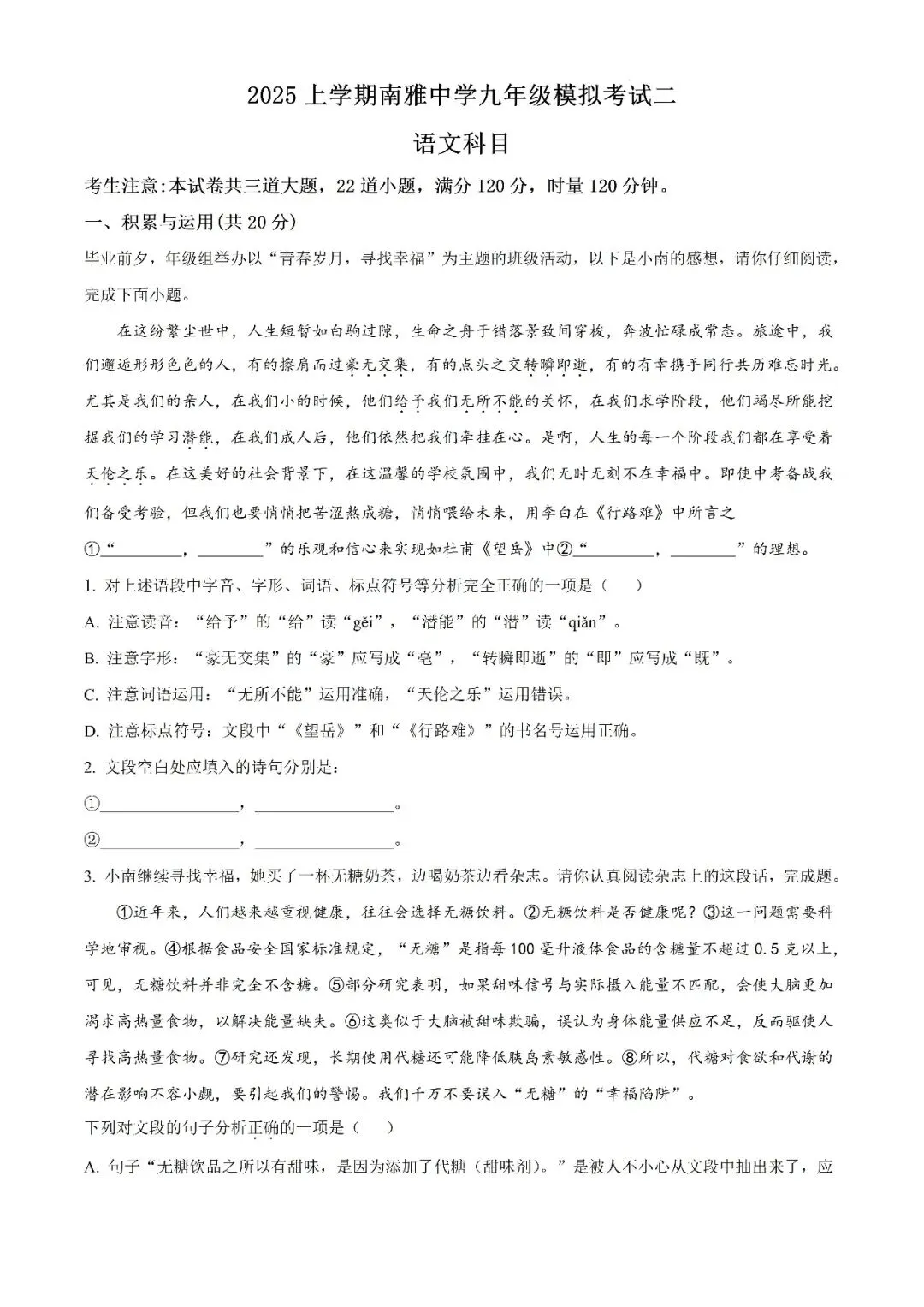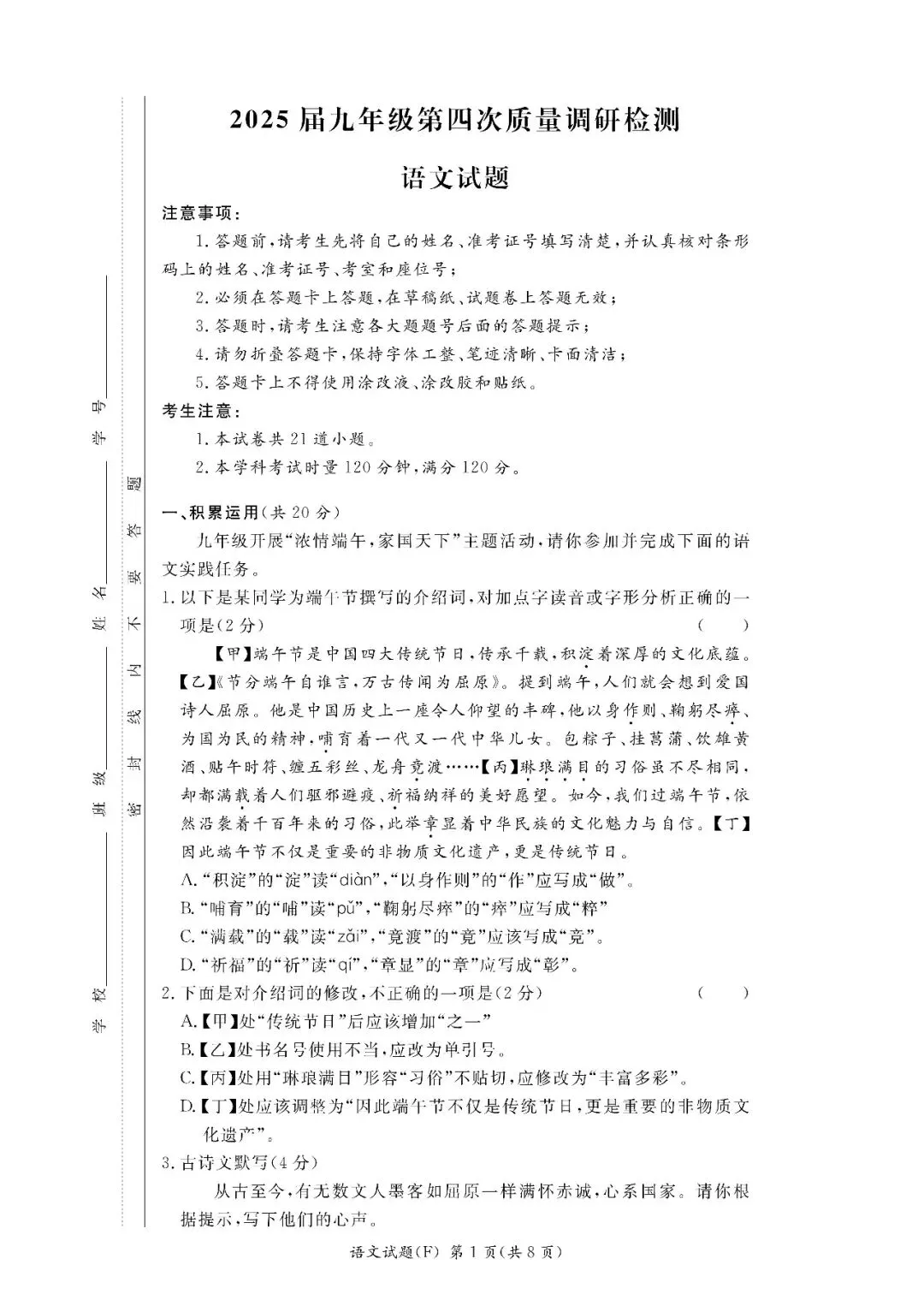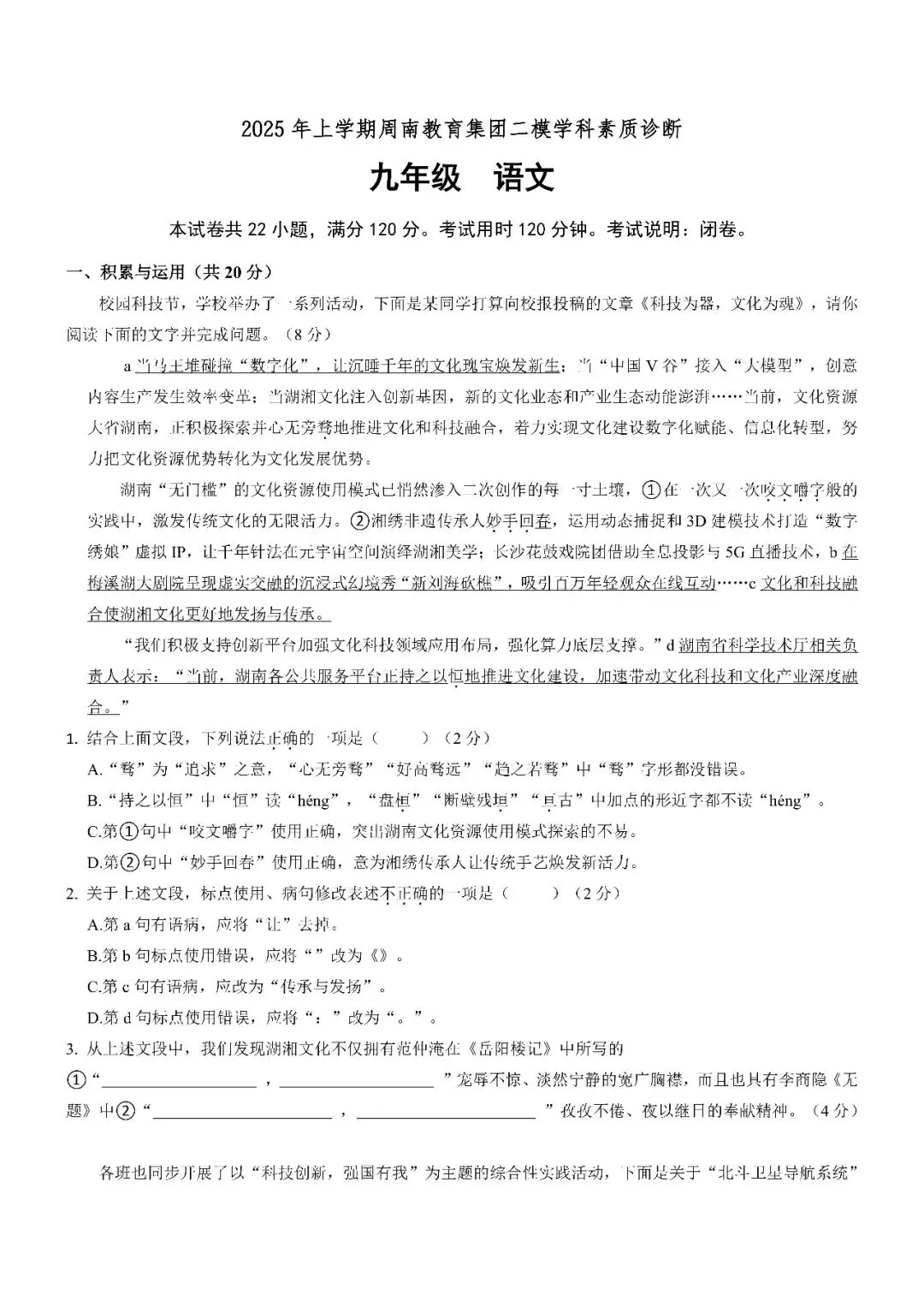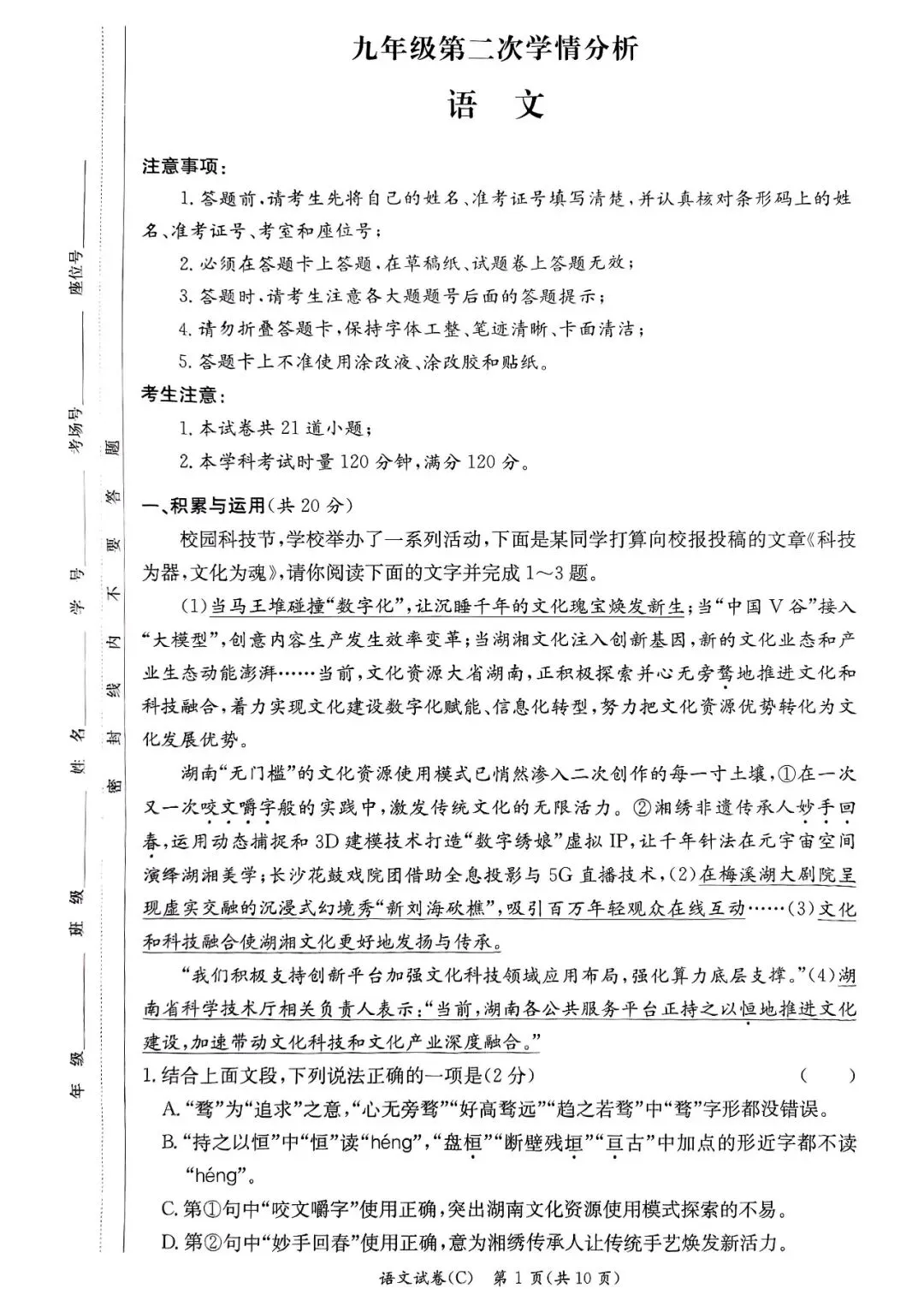 【真题汇总】——2025年长沙九年级下册入学检测语文试卷+参考答案(免费领取)