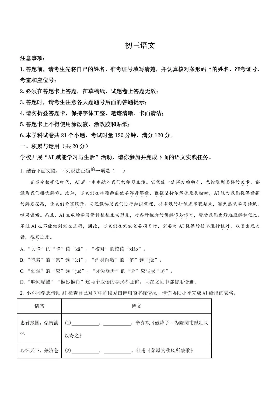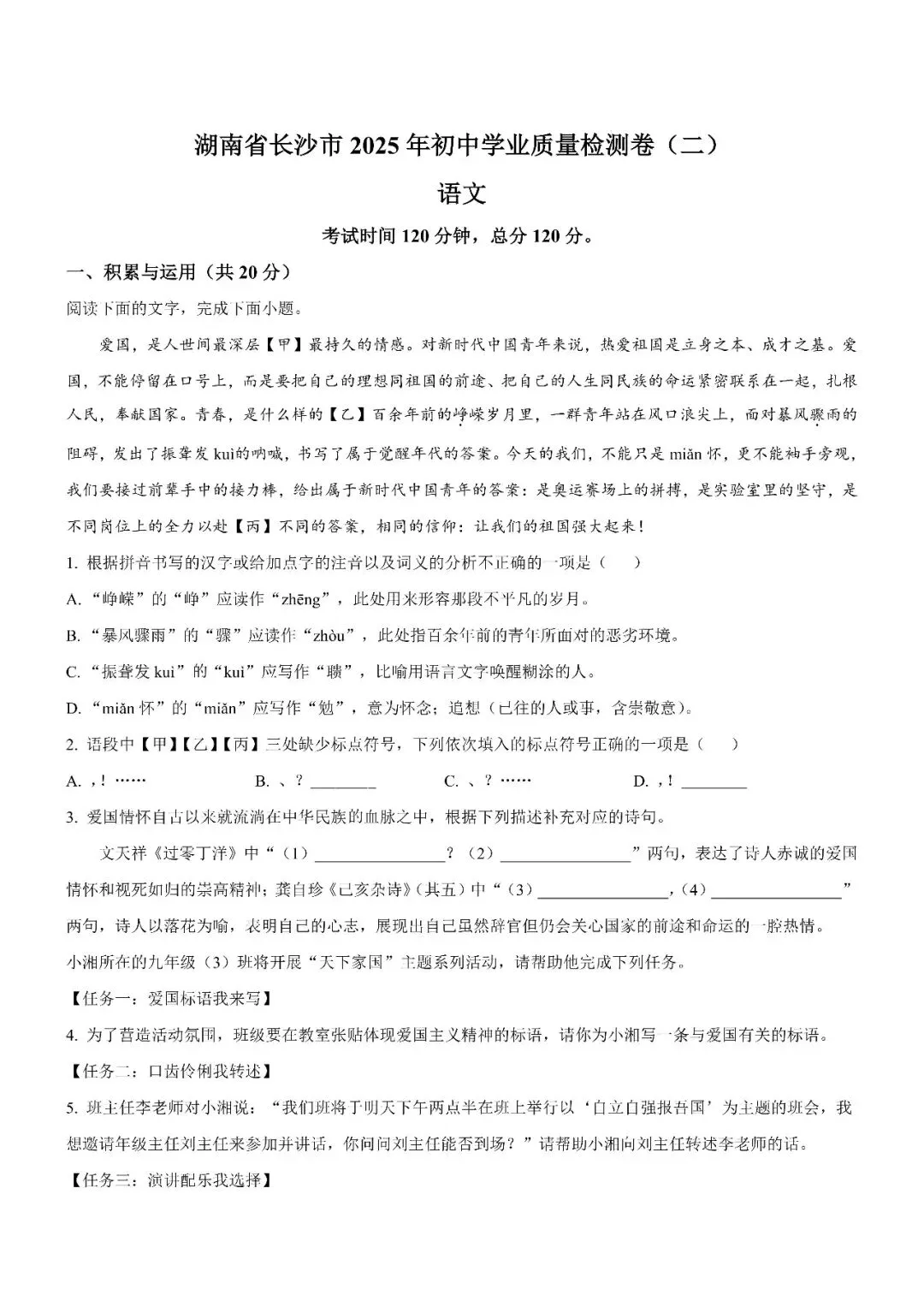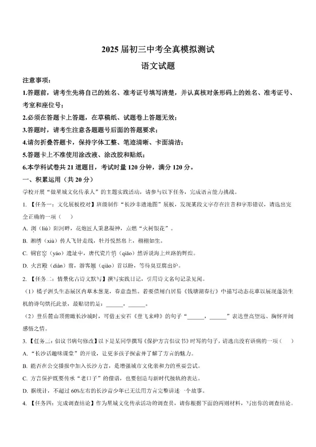 【真题汇总】——2025年长沙九年级下册中考一模语文试卷+参考答案(免费领取)