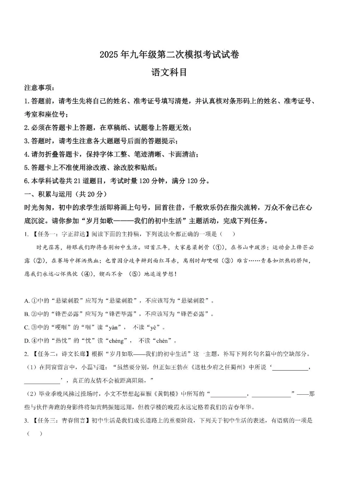 【真题汇总】——2025年长沙九年级下册第一次语文检测试卷+参考答案(免费领取)