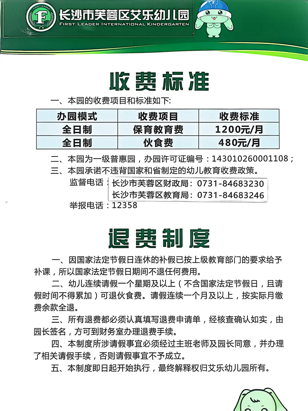 2026年春季收、退费公示——长沙市芙蓉区艾乐幼儿园