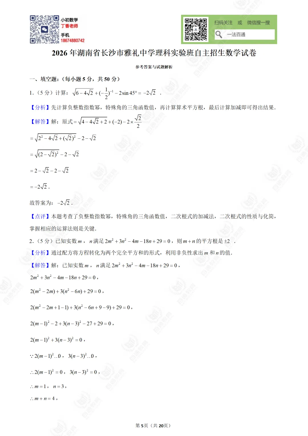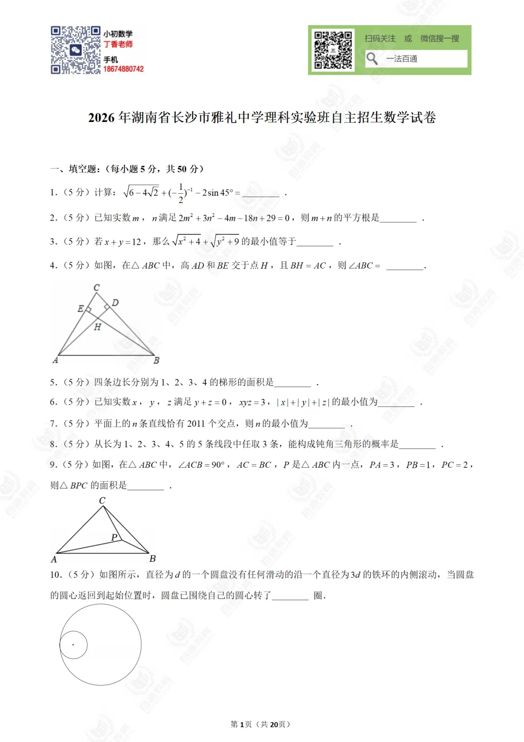 2026年湖南省长沙市雅礼中学理科实验班自主招生数学试卷(含答案)