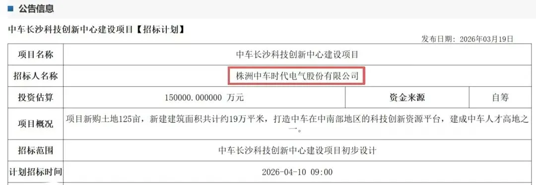 3月19日,株洲中车时代电气股份有限公司发布中车长沙科技创新中心建设项目招标计划,总投资15亿元,选址湘江科学城首开区,建设周期为2026年—2028年。该项目将打造成全国领先的轨道交通智能装备创新高地,成为长株潭都市圈科创协同的 “核心引擎”。