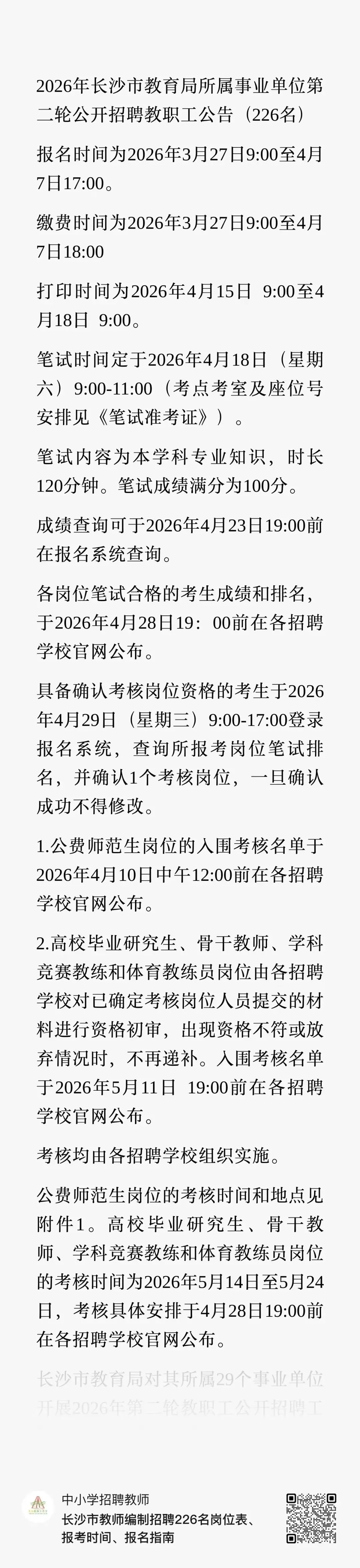 2026年长沙市教育局所属事业单位第二轮公开招聘教职工公告(226名)报名时间为2026年3月27日9:00至4月7日17:00。