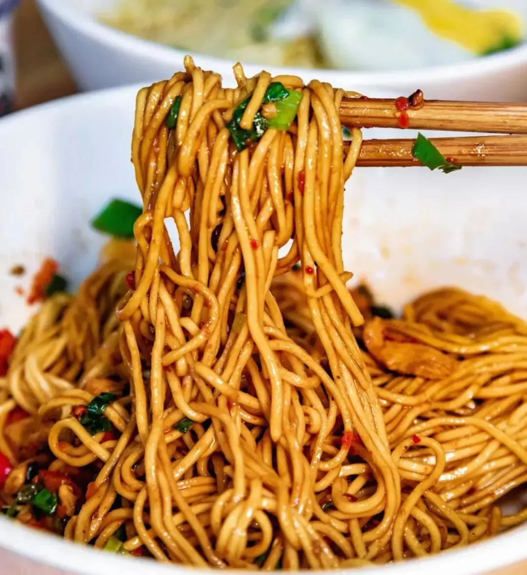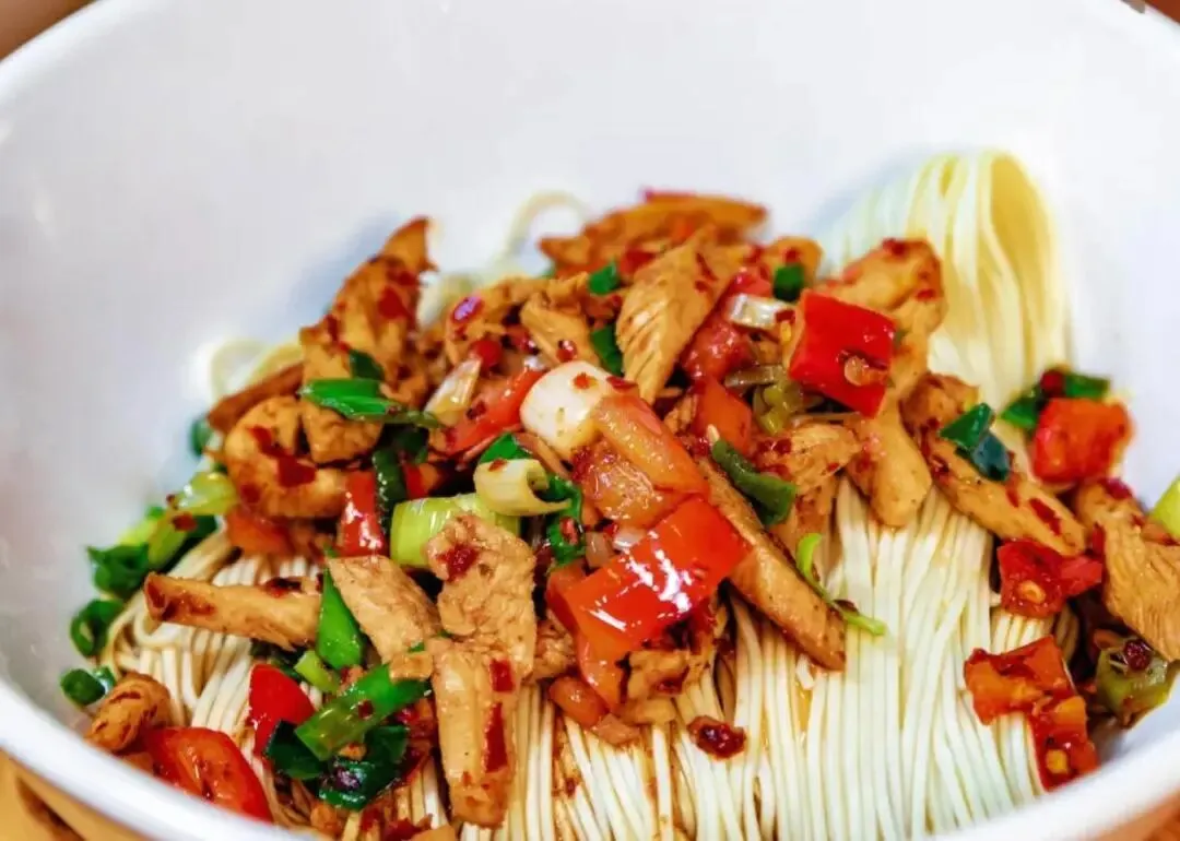 这个麻辣鸡丝干拌面,味道确实可以。面条用的是碱水面,吃起来很有嚼劲,味道也很香。鸡丝撕成一条条的,给的分量很足,里面放了好多青红辣椒。