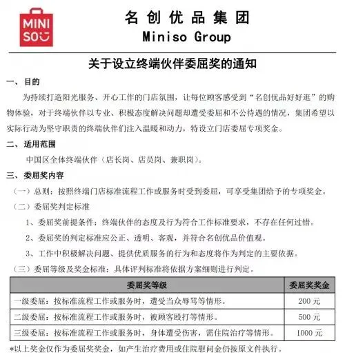 2024年4月,名创优品集团内部发布《关于设立终端伙伴委屈奖的通知》。如出现被顾客殴打等情况,可获得500元委屈奖奖金。