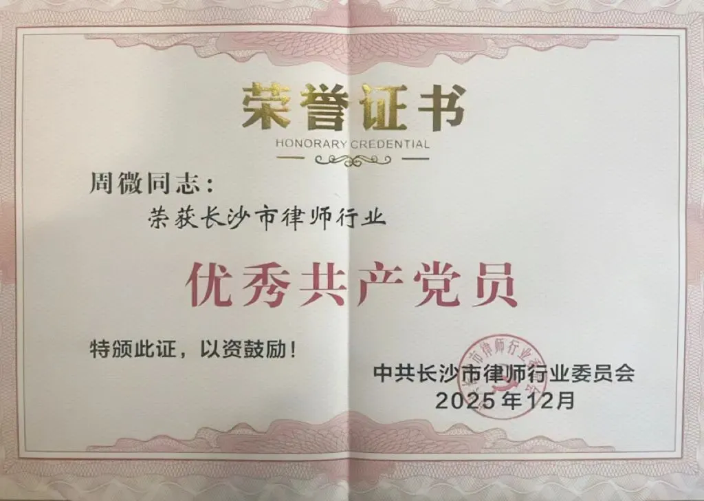 2026年3月20日 ,长沙市律师行业基层党组织书记现场述职暨2025年度“ 两优一先”表彰会议在市司法局隆重召开。大湘律师事务所周微律师凭借坚定的政治立场、扎实的专业素养与突出的先锋模范作用,荣获“律师行业优秀共产党员 ”。