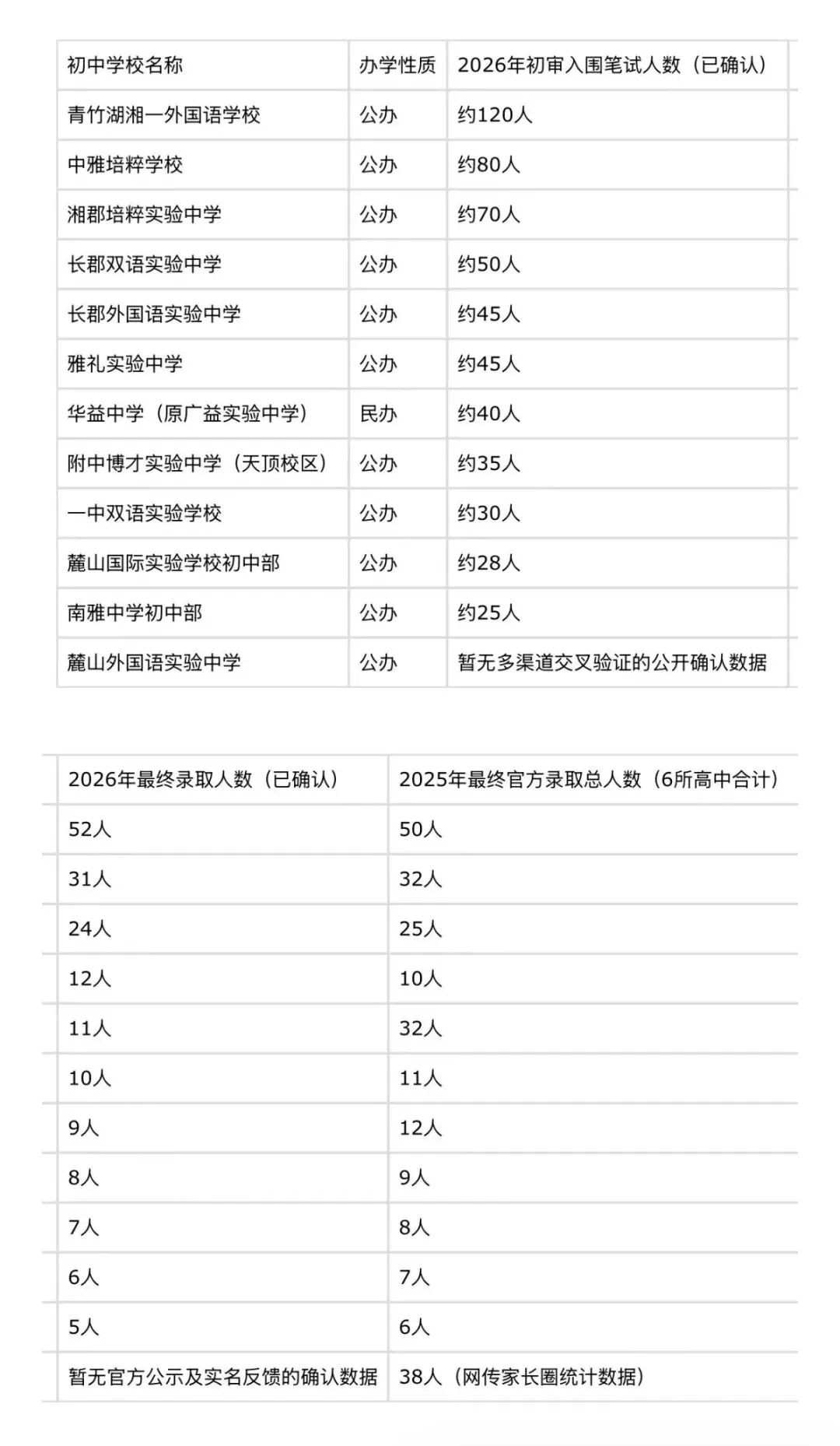 青竹湖湘一:2026年录取52人(2025年59人),四大率30%+,公办第一,转公后仍保持碾压优势。