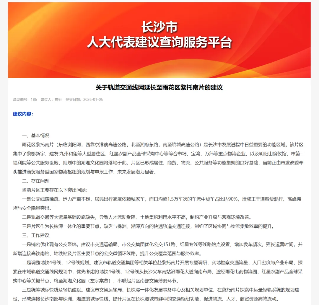这个片区位于浏阳河西岸,聚集了黎郡新宇等大型社区、红星全球农批中心以及多个重点物流园。但长期以来,这里被高速和高架包围,公交运力严重不足,居民戏称“进城难”。今年初,长沙市人大代表专门提交了《关于轨道交通线网延长至雨花区黎托南片的建议》,直指该片区作为长株潭一体化节点,却缺乏与株洲、湘潭方向的快速轨道交通连接。官方调研显示,该区域日均车流超1.5万车次,其中货车占比高达90%,客货混行不仅拥堵,还存在安全隐患。