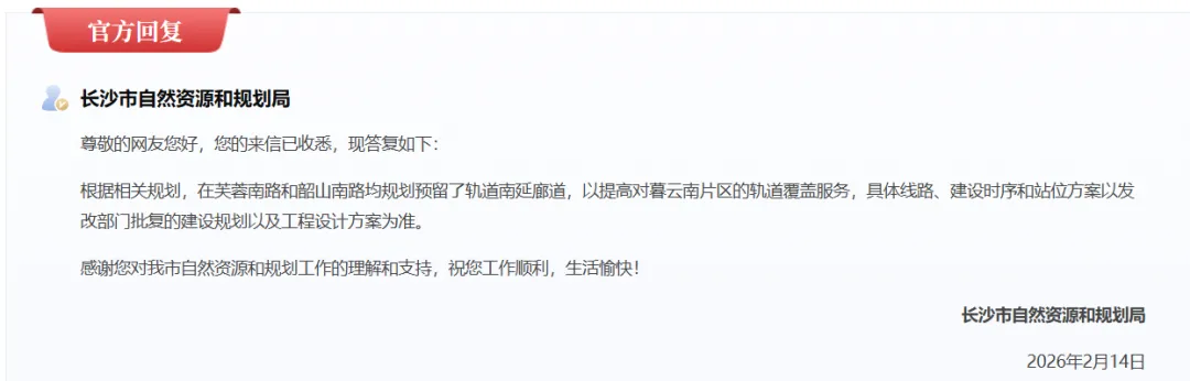 地铁1号线开到尚双塘就戛然而止,再往南直到暮云、株易路口的大片区域,常年处于“看得见地铁,坐不上”的尴尬境地。随着长株潭融城提速,南城市民对1号线继续南延的呼声越来越高。尤其是芙蓉南路沿线,新建小区扎堆,居民日常通勤严重依赖早已饱和的公交线路。在很早以前的文章中,本人曾提及过,见《长沙地铁1号线南延确定了?当城市雄心遇见民生之痛——长沙地铁1号线的艰难进化论!》今年初,天心区在相关回复中明确表示,正积极争取将1号线南延纳入下一轮建设规划,但具体实施时间还是没定。对住在南边的老百姓来说,这条线既关系到融城的大战略,也实打实影响着几十万人的日常出门。“最后1公里”何时能通了,是居民们盼望解决的问题。