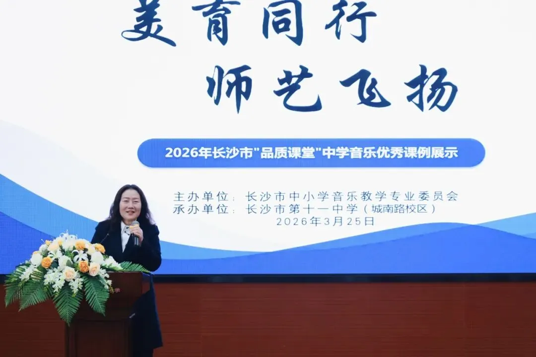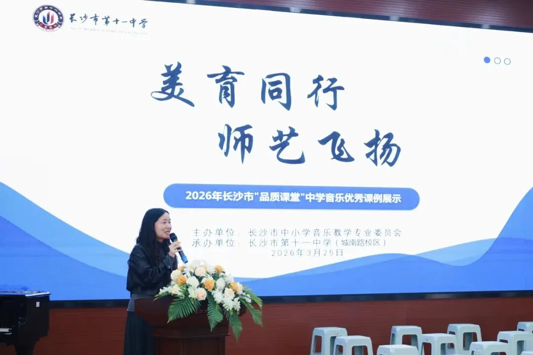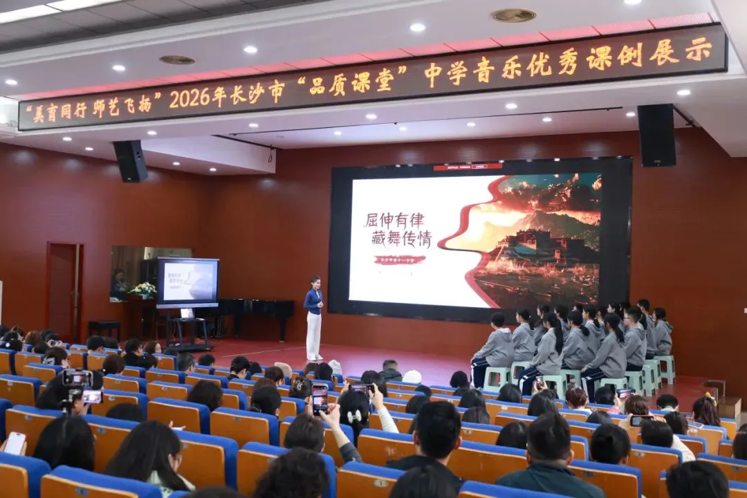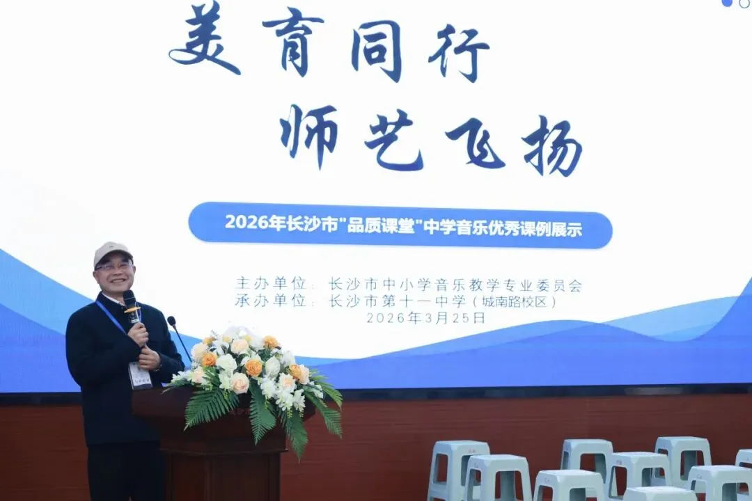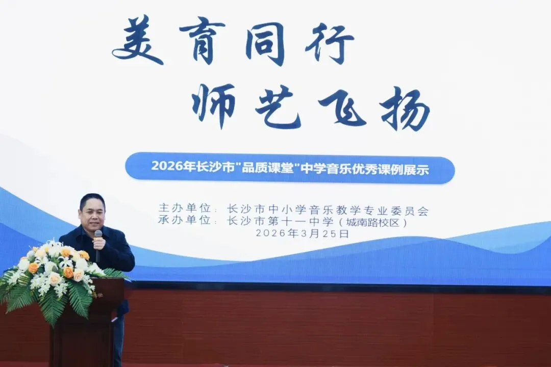 为深化音乐课程改革、推广优质教学范式、提升教师专业能力、落实美育核心素养,2026年3月25日上午,长沙市音乐教研活动在长沙市第十一中学城南路校区成功举办。湖南文艺出版社副社长孙红成博士,湖南省教育科学研究院音乐教研员、湘艺版艺术教材副主编薛晖,长沙市教育科学研究院艺体中心主任、音乐教研员娄瑶琪,我校校长张桂元,音乐教研组长王韬,长沙市音乐教研理事、各区县音乐教研员,以及全市中小学音乐教师代表共同参与本次活动。