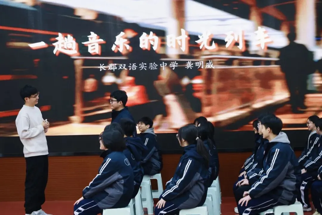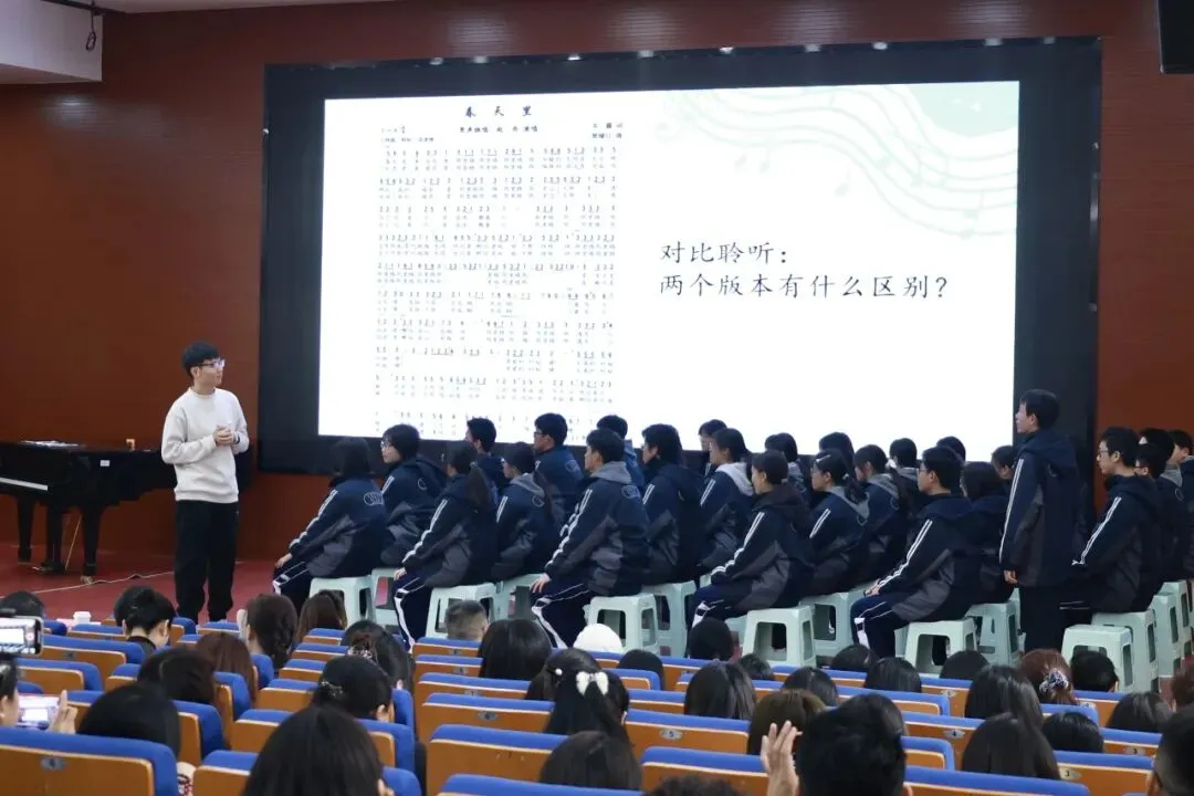 第一节品质课堂由长郡双语实验中学龚明威老师带来音乐鉴赏课《一趟音乐的时光列车》,教授学段为高一年级。教学过程中,龚老师带领学生通过聆听感知、对比分析、演唱实践等多种方式,共同探究了不同时期中国流行音乐在旋律结构、节奏特点、歌词创作上的差异,以及歌曲演唱技巧与表达方式的变化。从探究结果中可以看出,在中国流行音乐的发展历程中,随着时代背景的变迁,歌曲的主旨内涵也发生了显著转变——从聚焦时代脉搏、传递历史时代精神,逐步转向贴合个体体验、抒发内心深处的情感表达。