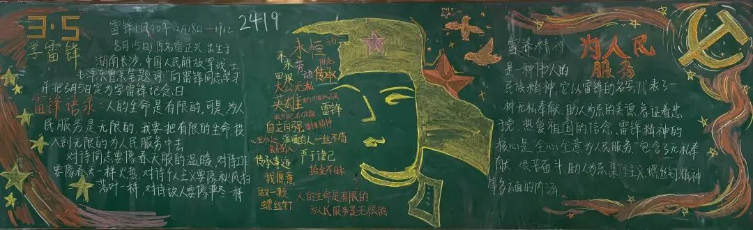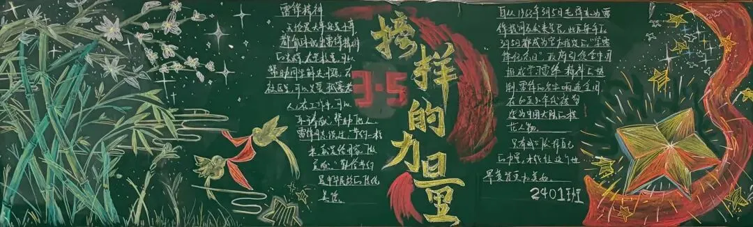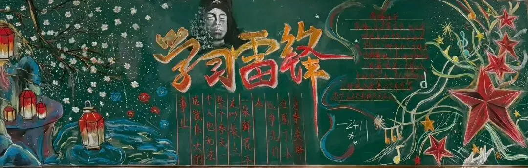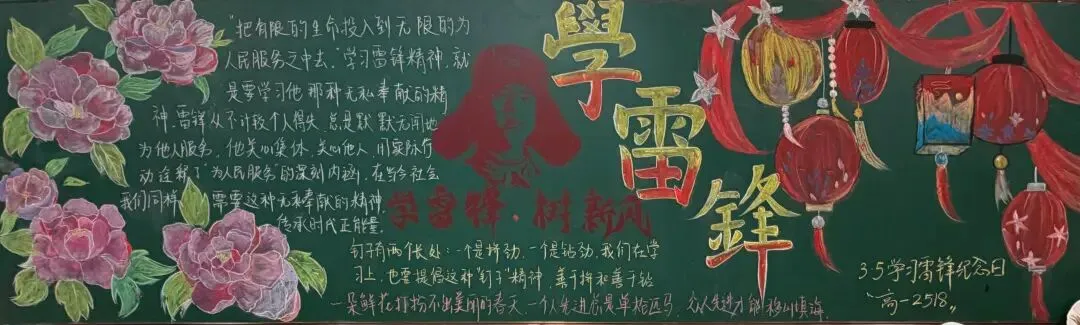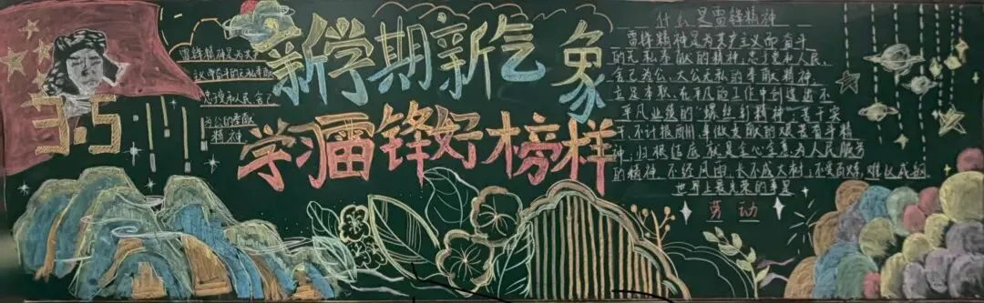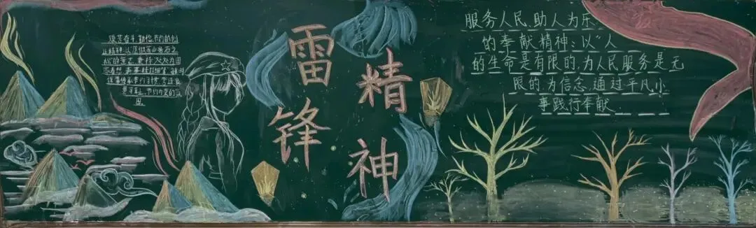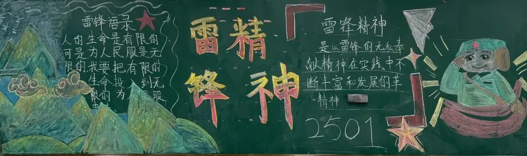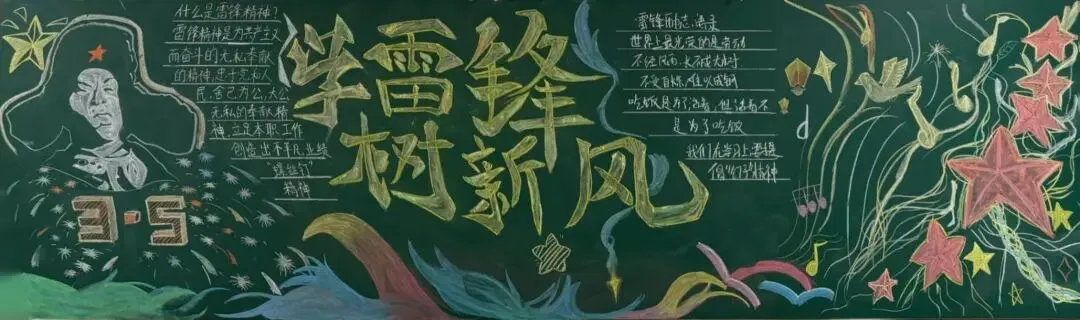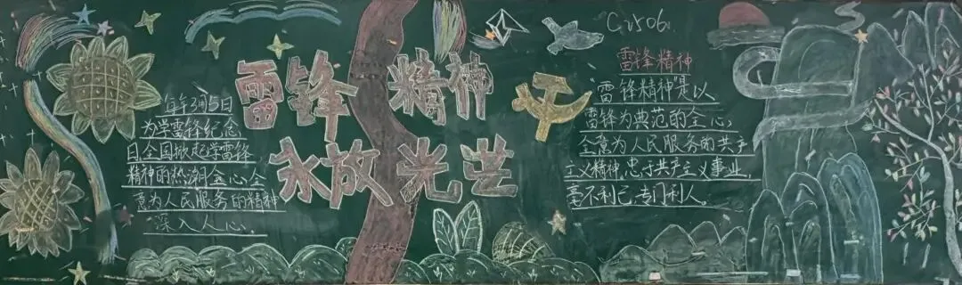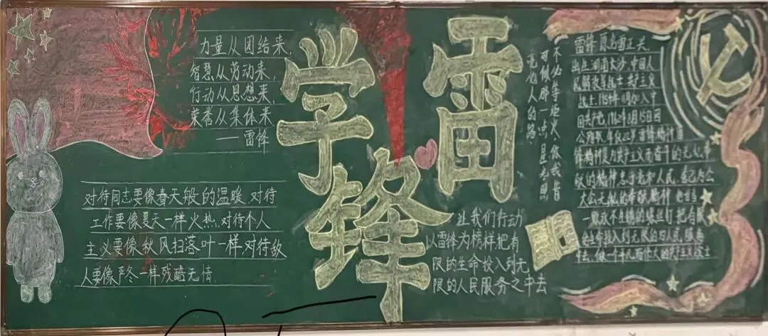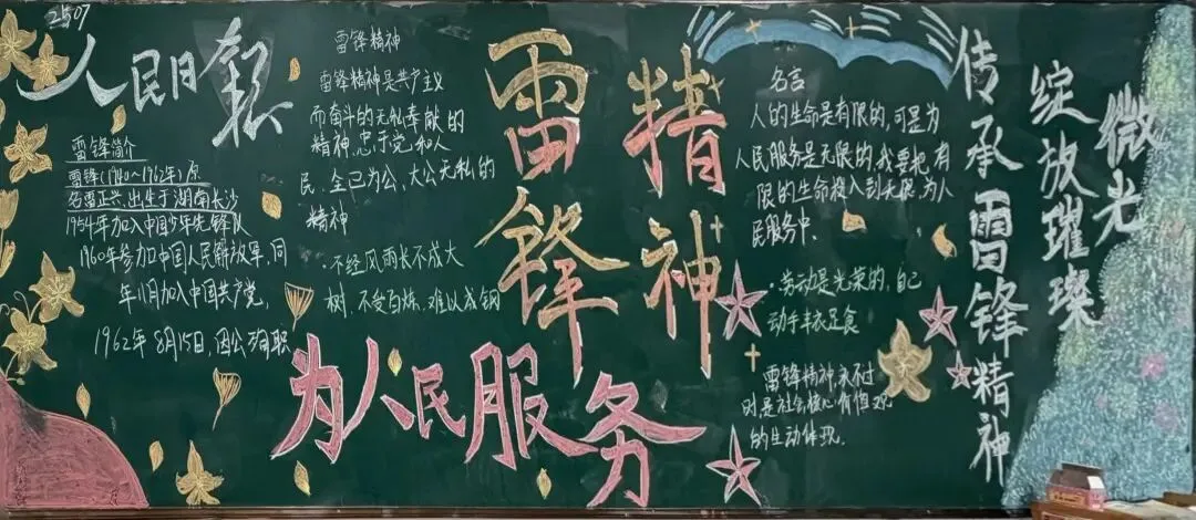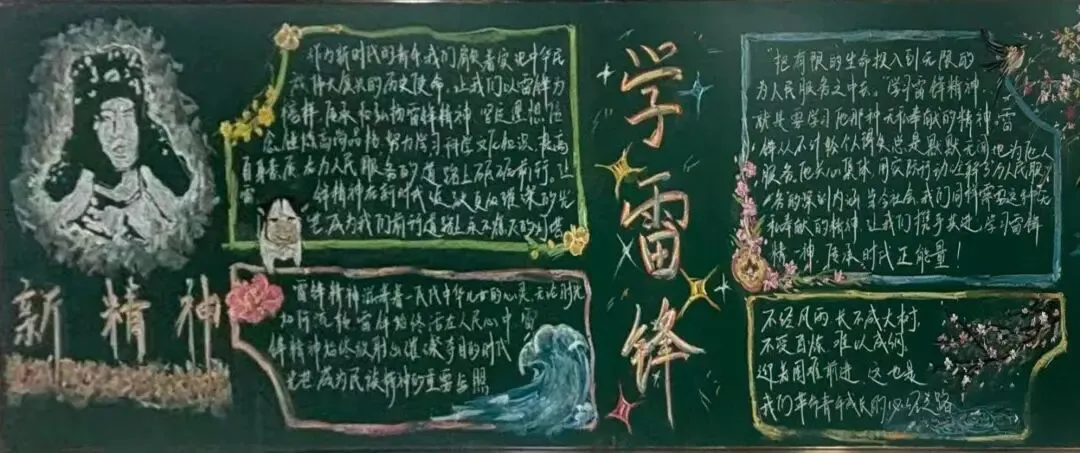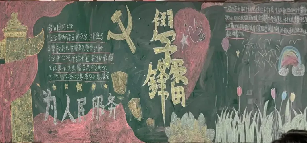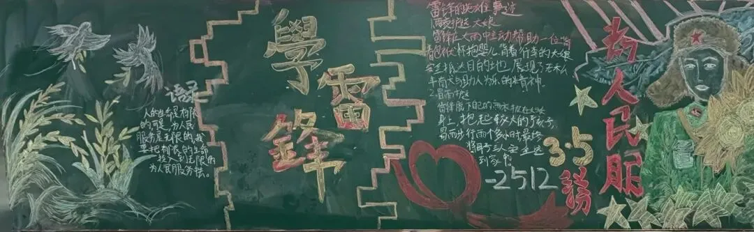 一块黑板,见证着一个班级的精神风貌。从构思到落笔,从空白到丰满,每一处插画、每一行文字的背后,都是同学们对雷锋精神的深入研读与用心诠释。黑板报创作的过程,本身就是一次集体的精神洗礼。当全班同学围绕同一主题群策群力时,雷锋所说的“一个人先进总是单枪匹马,众人先进才能移山填海”便在这一刻照进了现实。