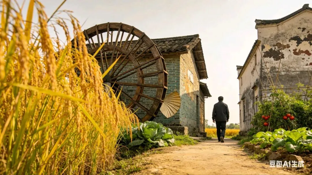 走在乡间小路上,青砖老屋、水车、稻田、菜园……