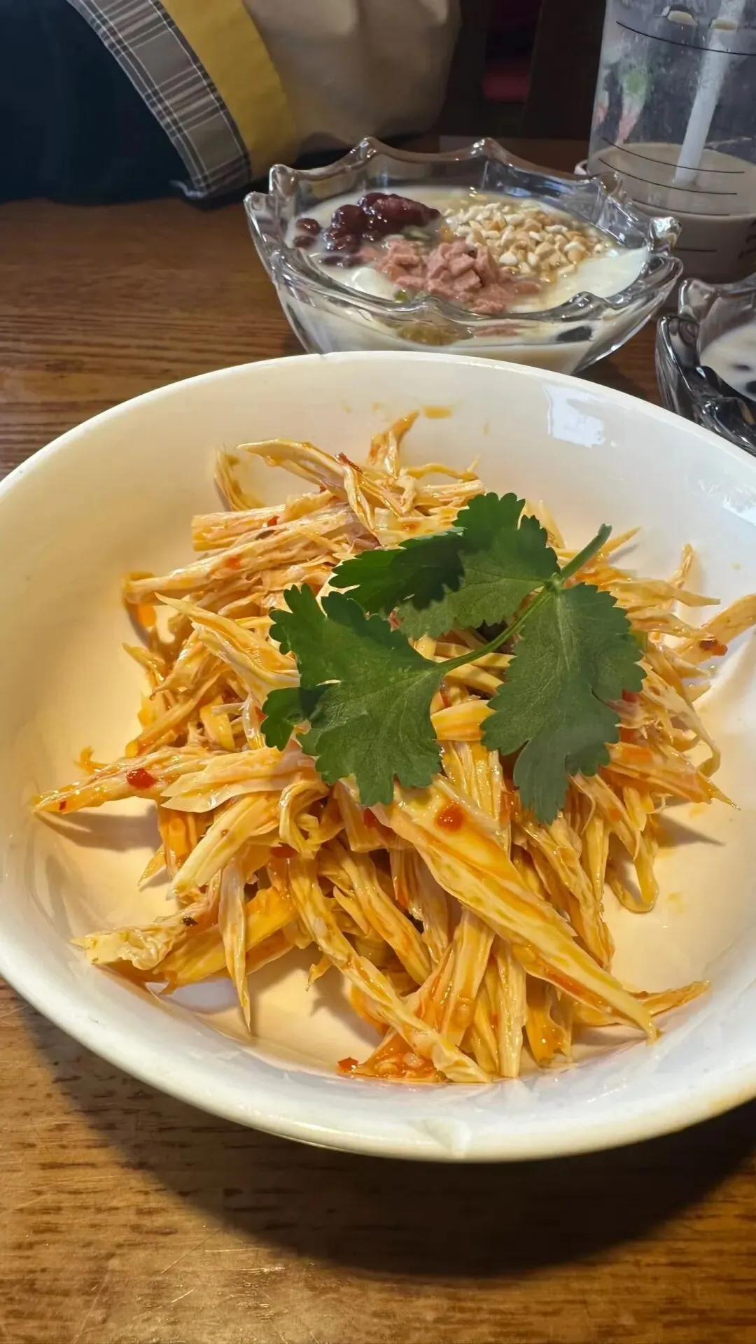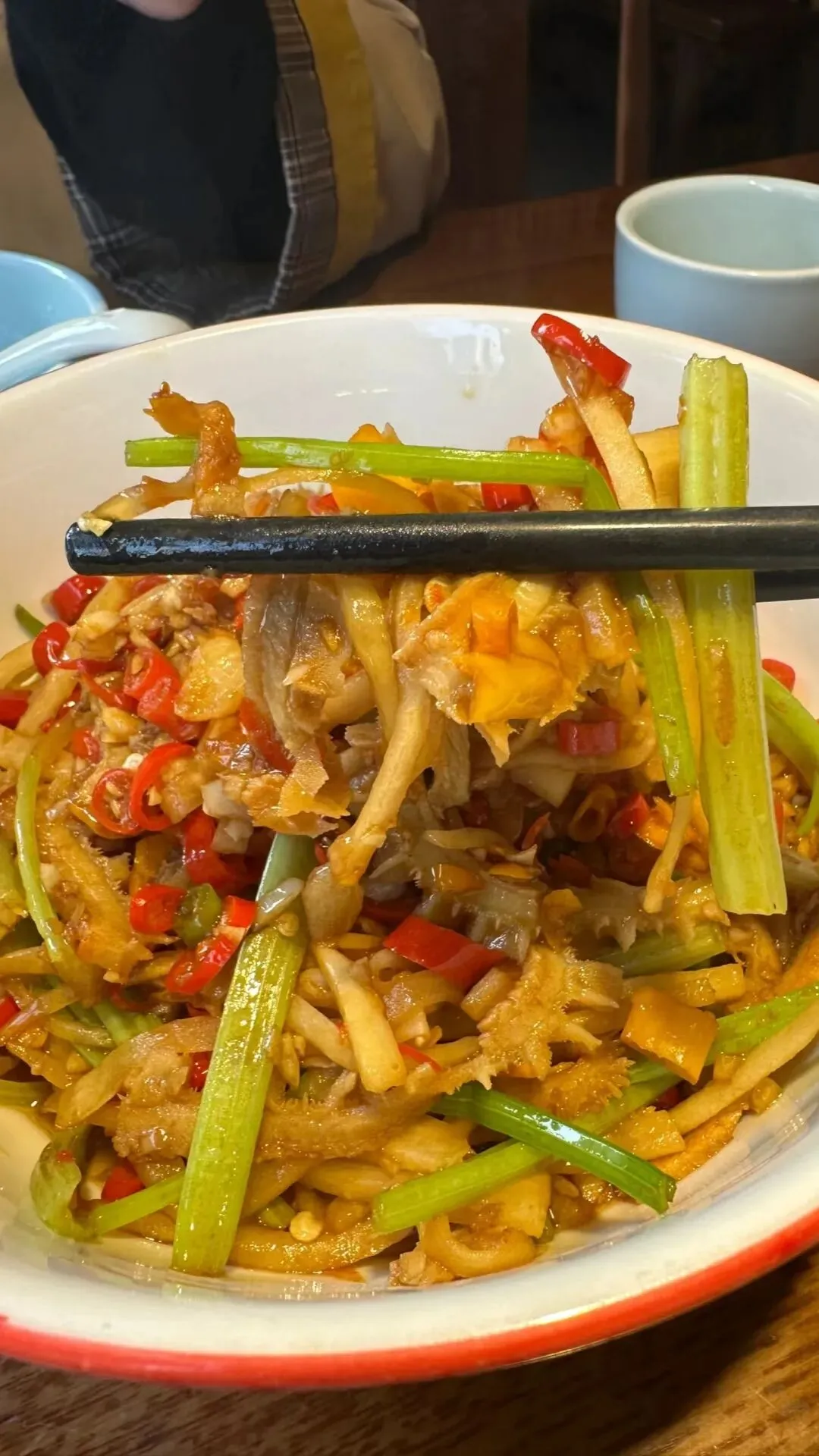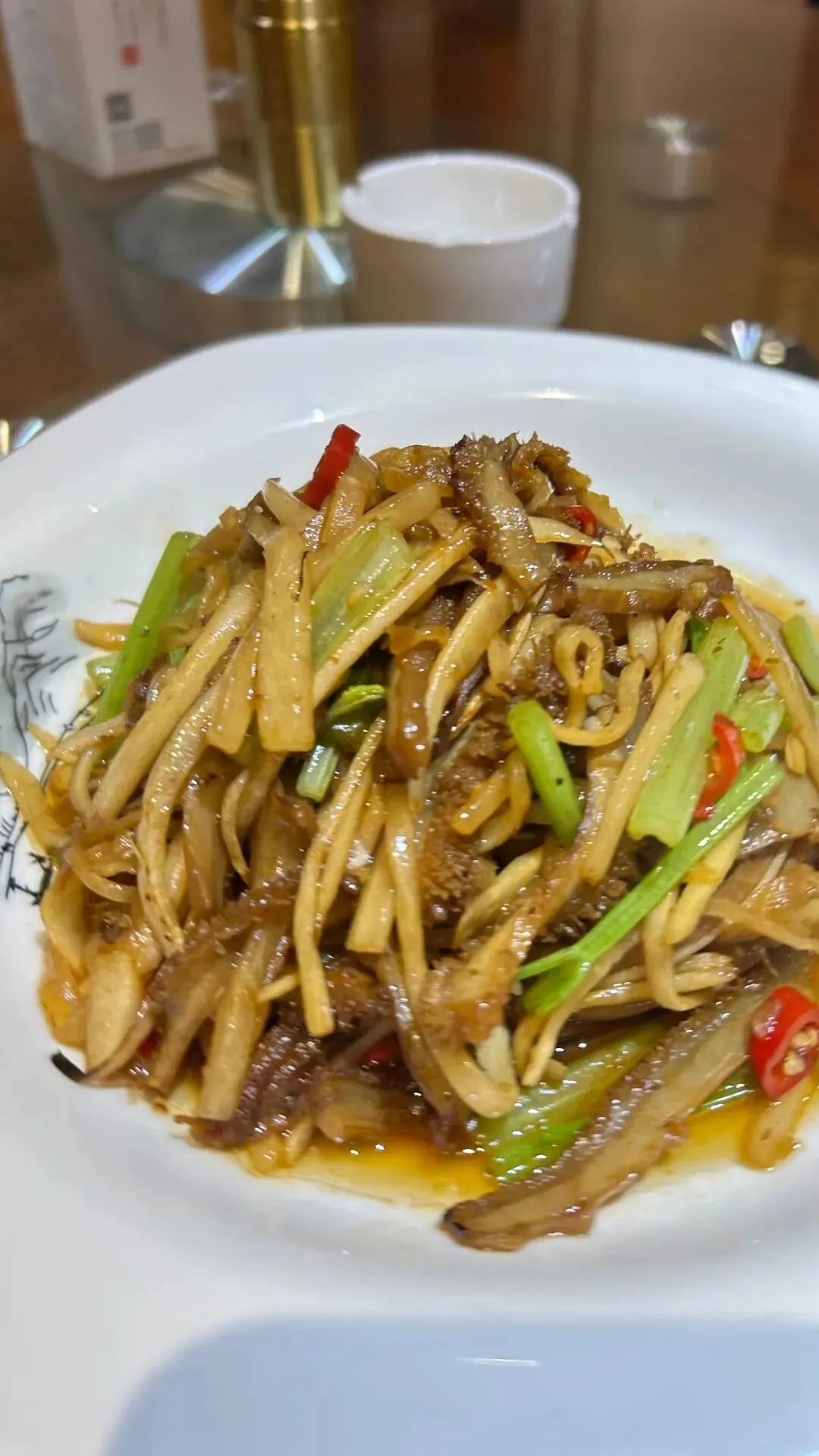 牛百叶切得细如发丝,根根均匀,搭配泡椒、干辣椒、蒜苗爆炒,酸辣开胃,脆爽弹牙,没有一点腥味。入口酸辣鲜香,脆嫩爽口,口感层次超丰富,是下饭下酒的绝配,吃过的人都夸绝,非遗湘菜代表作名不虚传!