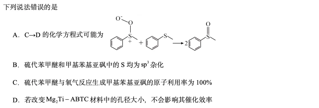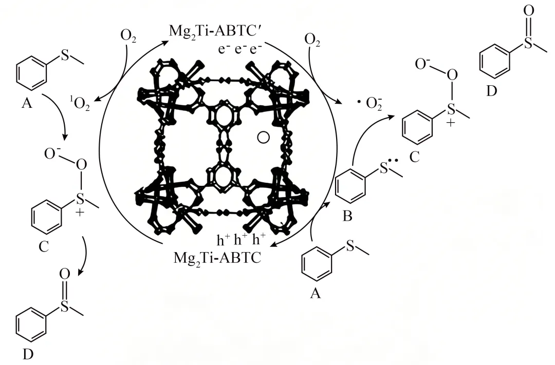 题目展示了一种稳定、高度多孔的双金属Ti-MOF材料——Mg₂Ti-ABTC 。在光照的“指挥”下,它能像高效的“调度员”一样,让空气中的氧气与硫代苯甲醚(A)发生反应,精准地生成甲基苯基亚砜(D)。