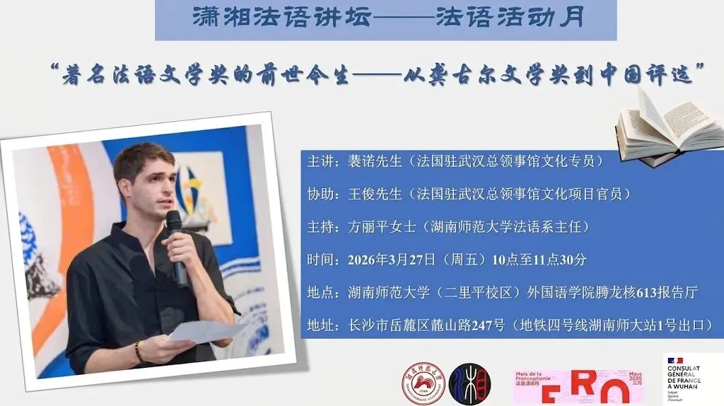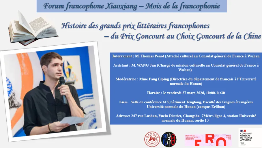 3月27日上午,在湖南师范大学(二里半校区)外国语学院腾龙楼613报告厅,法国驻武汉总领事馆文化专员裴诺(Thomas Penot)先生将为法语系师生做专题讲座《著名法语文学奖的前世今生——从龚古尔文学奖到中国评选》(Histoire des grands prix littéraires francophones – du Prix Goncourt au Choix Goncourt de la Chine)。讲座结束以后,法语系研究生们将分享其对龚古尔文学奖的感受,对所读作品的感受及对最喜爱的作品的感受。裴诺先生、王俊先生、方丽平老师,以及参与第六届“龚古尔文学奖中国评选”的研究生,将与听众进行互动交流。