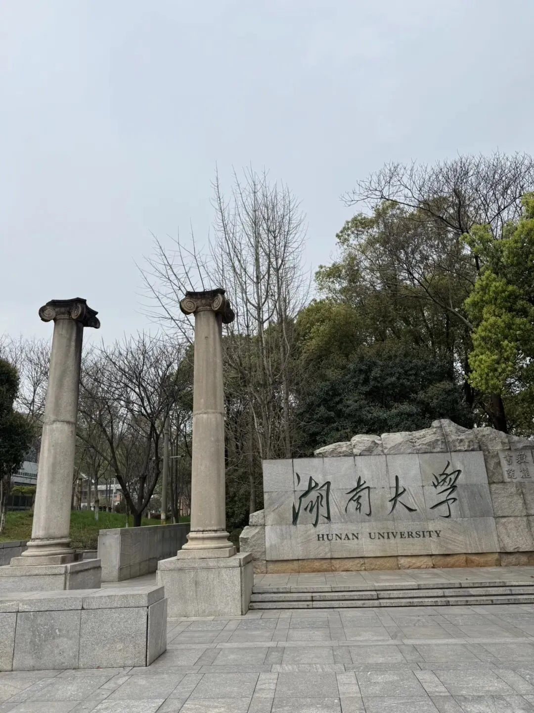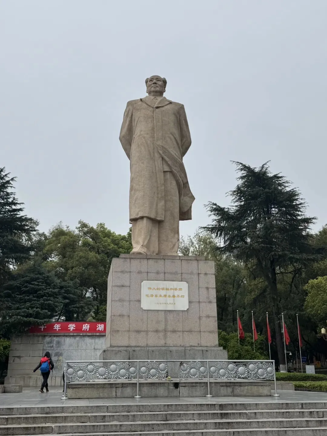 首先导航至湖南大学这里进去,走一段长长的林荫路可至东方红广场,有伟人的雕像。