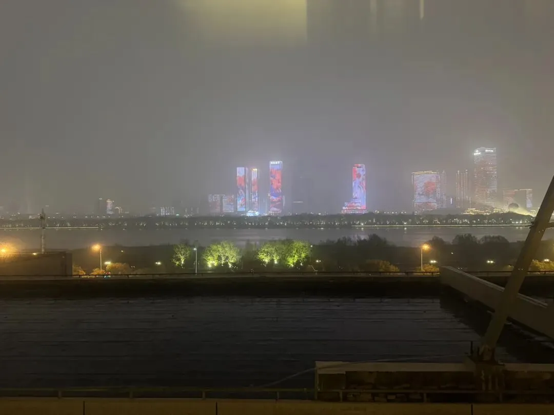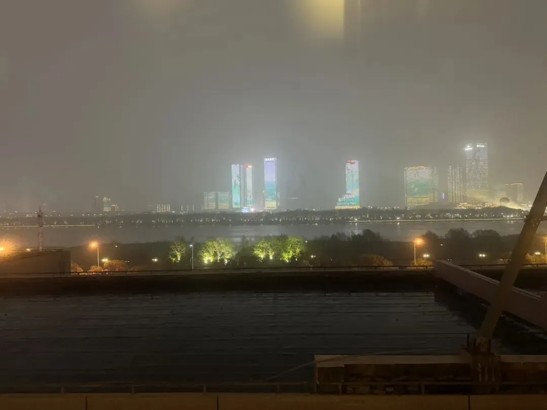 夜幕下烟雨朦胧中的湘江灯光秀。