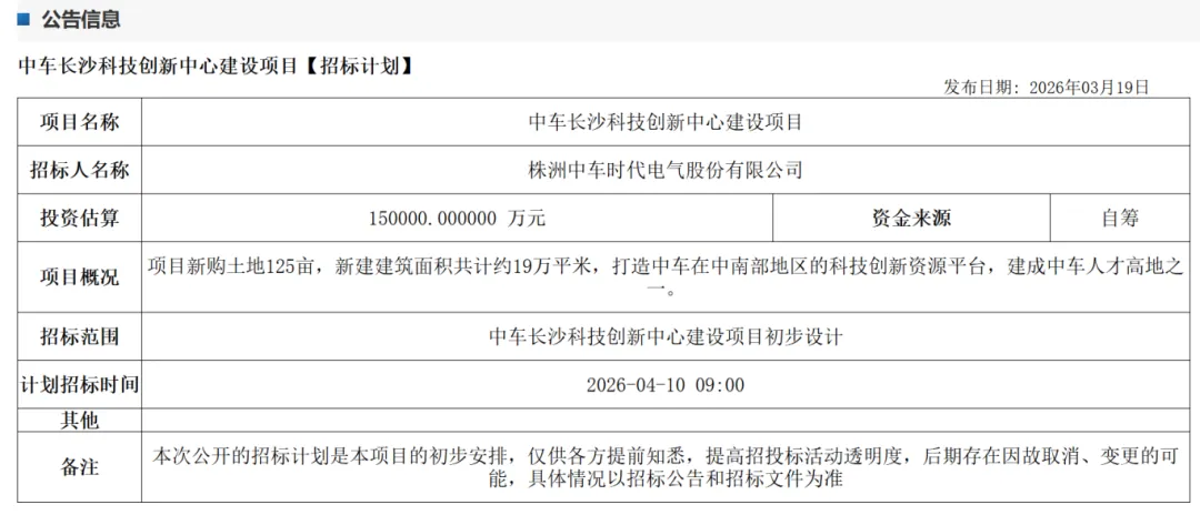 近期,长沙公共资源交易中心发布“中车长沙科技创新中心建设项目【招标计划】。根据项目招标内容:项目新购土地125亩,新建建筑面积共计约19万平米,打造中车在中南部地区的科技创新资源平台,建成中车人才高地之一。计划招标时间:2026-04-10。投资估算:15亿元。