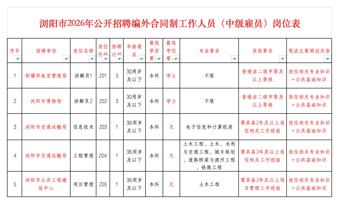附件:1. 浏阳市2026年公开招聘编外合同制工作人员(中级雇员)岗位表