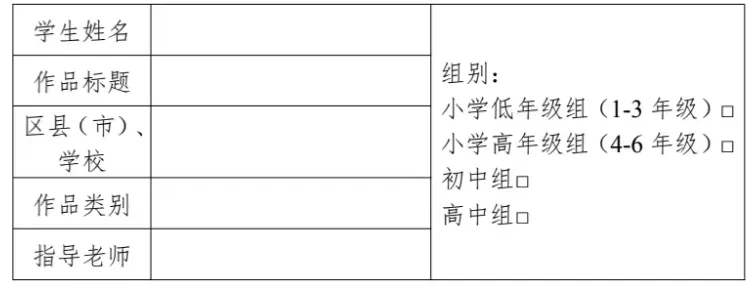 (二)电子版报名表请严格按照范表要求填写。作品类别栏:绘画、书法(软、硬笔)、篆刻、摄影、手工。作品名称一栏不得空白。填写不规范,信息不完整的表格视为无效表格。