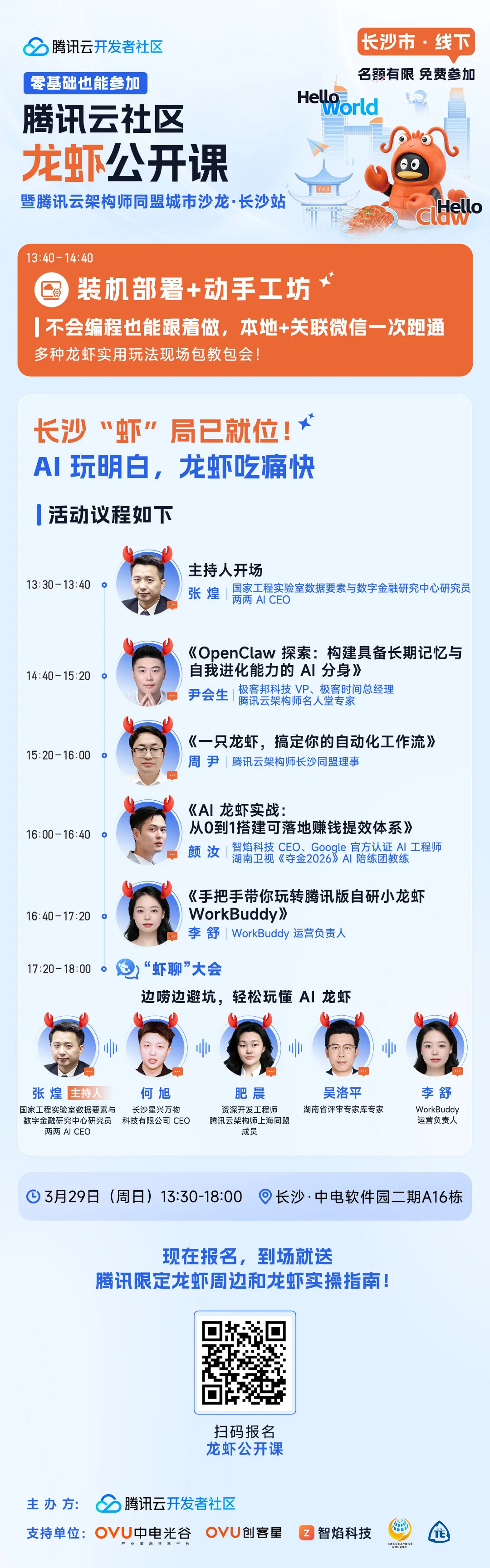 实战大咖围坐畅聊,趣味拆解龙虾困惑、分享长沙产业落地玩法、解答实操高频问题!全是真心话避坑干货,现场互动解锁 AI 龙虾隐藏玩法!