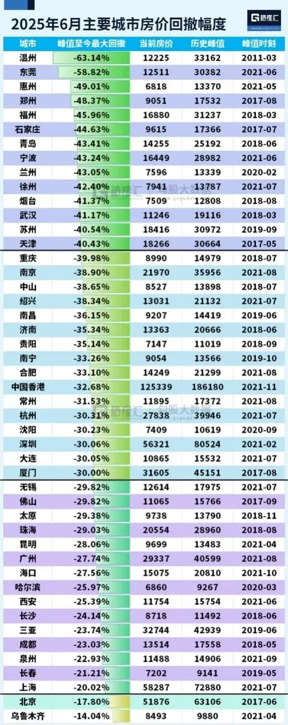 包括其他高房价收入比的城市,基本后续下跌幅度都很严重。像是上面那位长沙市民提到的武汉,下跌幅度接近长沙的两倍,如今两者的房价差距已经不大了。