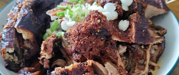 早上适合来一碗米粉,汤不花哨,但入口顺,热气一顶,人就醒了。中午可以吃武冈卤菜,尤其卤铜鹅、卤豆腐、卤猪脚,味道不是猛冲型,而是香气一层层往外走,咸鲜里带一点药材底子,越嚼越稳。晚上找家家常馆子,血浆鸭、酸辣仔姜炒肉都合适,辣劲来得快,可不粗,配一碗饭,犯困都值。街边还常见米花、锅巴一类小零嘴,脆生生的,走着吃也不折腾。