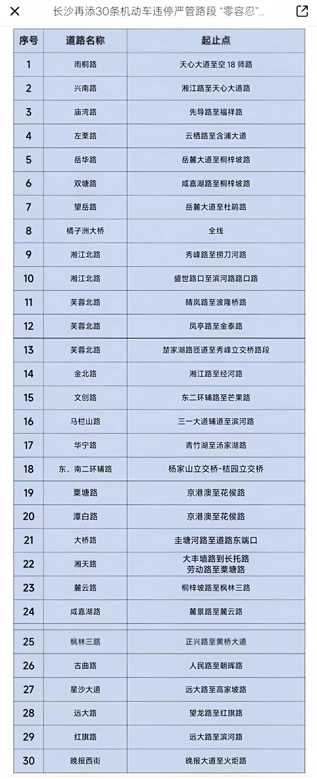 完整名单在“长沙交警”微信公众号可查,就不附上了,但就是越中心的路段,肯定管理越严格,一般这个车停在这里,交通就会堵塞,肯定也管理越严格。