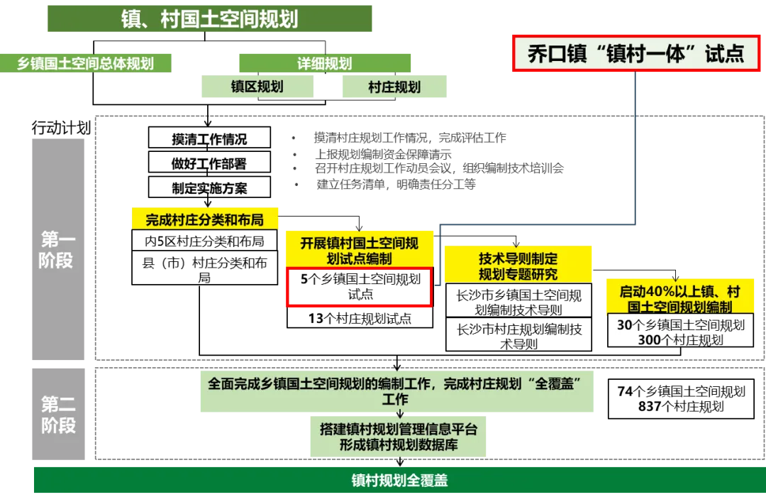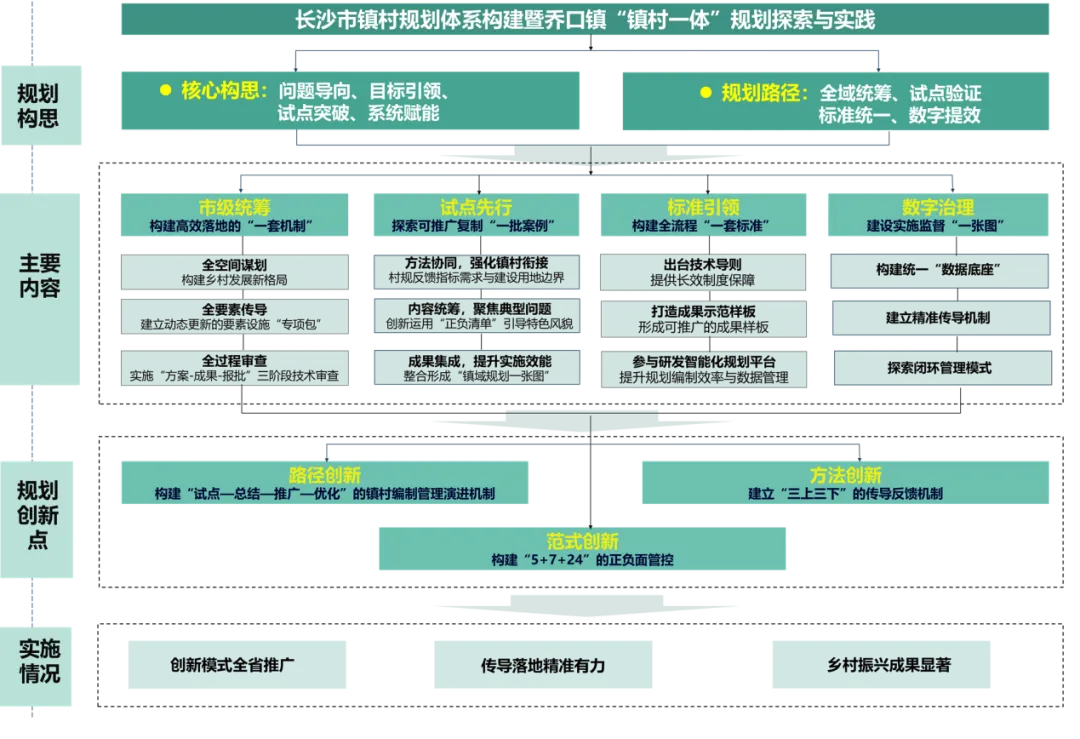 为落实湖南省关于国土空间规划的总体部署、长沙市三级三类规划体系要求,针对传统镇村规划存在的层级脱节、传导不畅、实施性弱等痛点,长沙市立足镇村发展实际,构建“宏观布局—试点先行—标准引领—数字治理”全链条、闭环式“ 镇村一体”规划编制管理体系,形成“多规合一”的“长沙样本”。其中,以乔口镇为典型的实践经验,获省内广泛认可与良好社会成效。