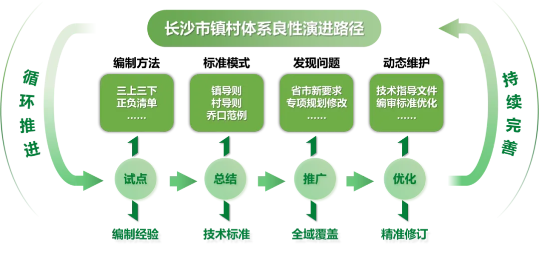 以乔口镇为样本,形成“试点探索、总结提炼、全域推广、反馈优化”完整闭环。先行开展试点,探索编制方法,检验并优化技术方法的可行性与有效性;将成功经验转化为标准模式全面推广,实现经验效益最大化;推广过程中建立动态维护机制,持续吸纳实践反馈,并通过出台配套政策对标准进行精准修订与迭代升级,最终推动规划体系持续完善、自我进化。