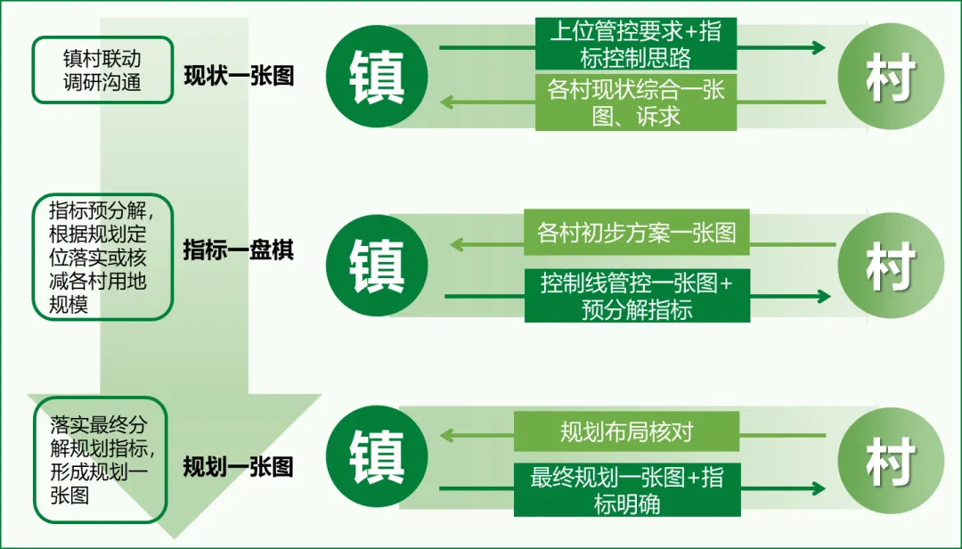 协调镇、村两级行政主体,在调研、方案、成果三个阶段,就管控要求、指标分解、村庄诉求等方面进行上下联动,做到镇域“国土空间现状一张图、指标分解一盘棋、规划成果一张图”。